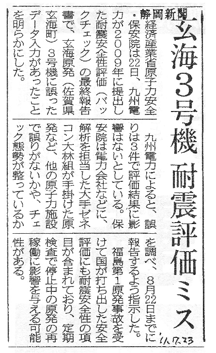 [2011_07_23_01]玄海3号機 耐震評価ミス(静岡新聞2011年7月23日)