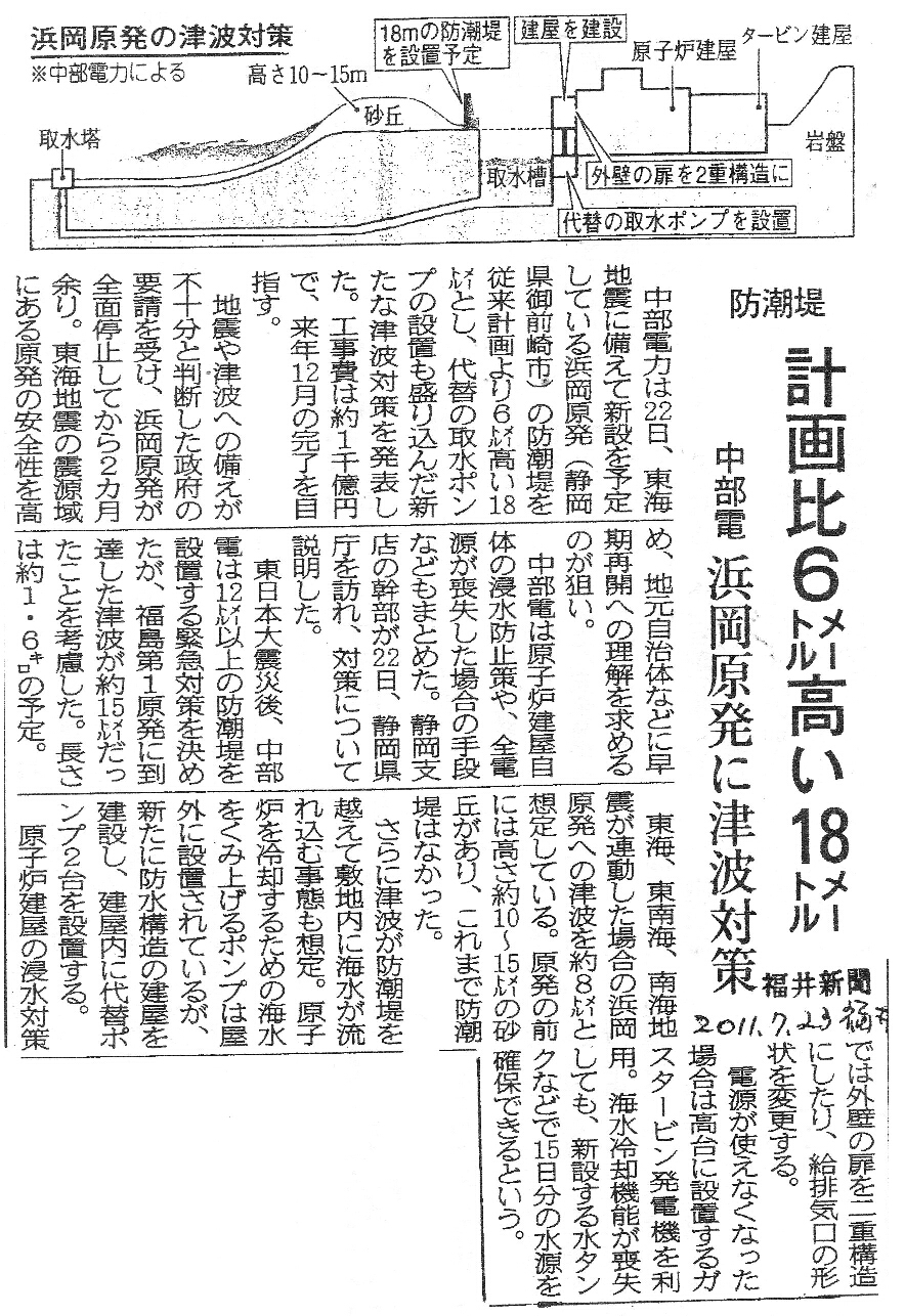 | [2011_07_23_02]防潮堤 計画比6メートル高い18メートル 中部電 浜岡原発に津波対策(福井新聞2011年7月23日) |