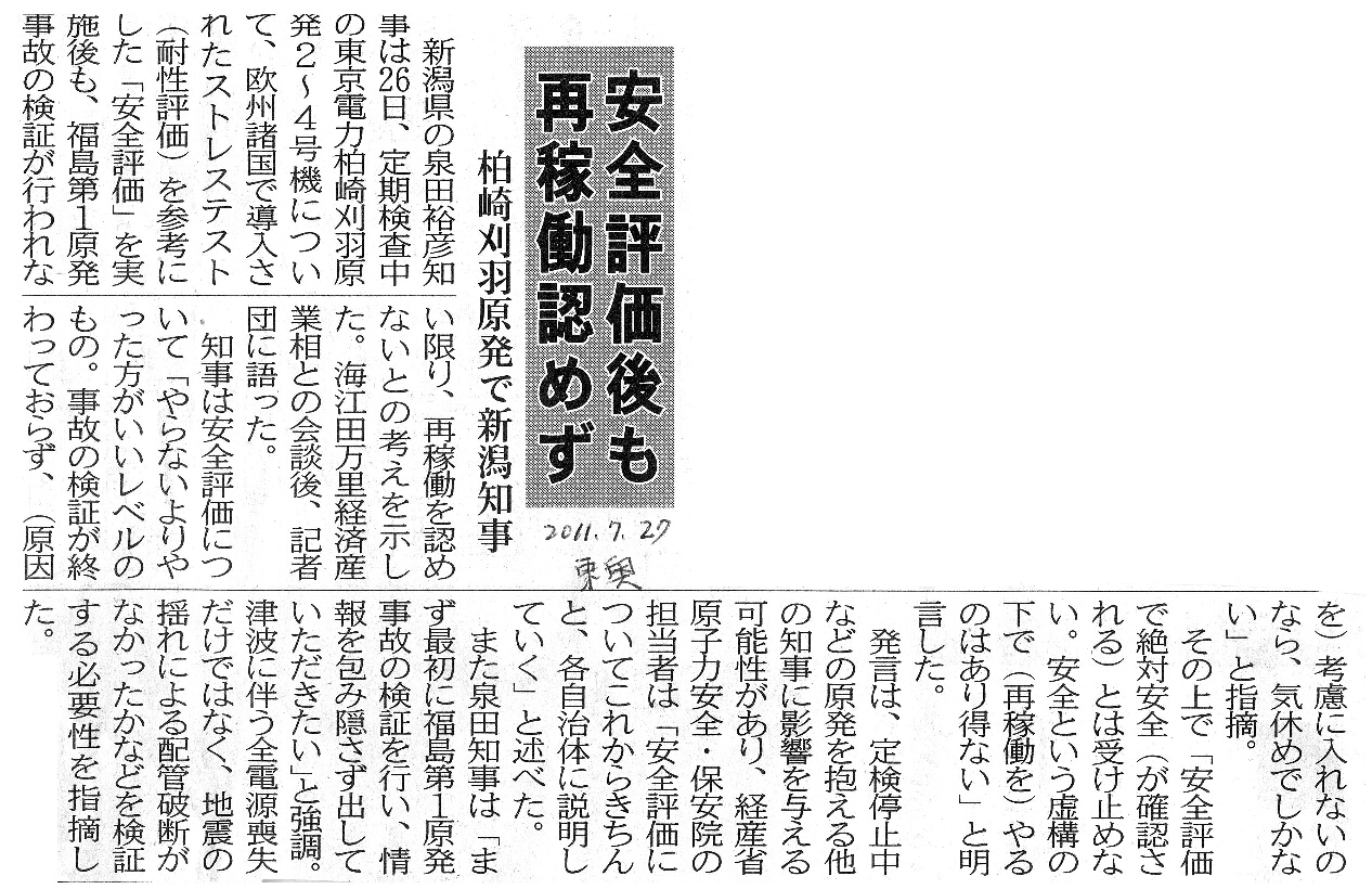 [2011_07_27_01]安全評価後も再稼働認めず 柏崎刈羽原発で新潟県知事(東奥日報2011年7月27日)