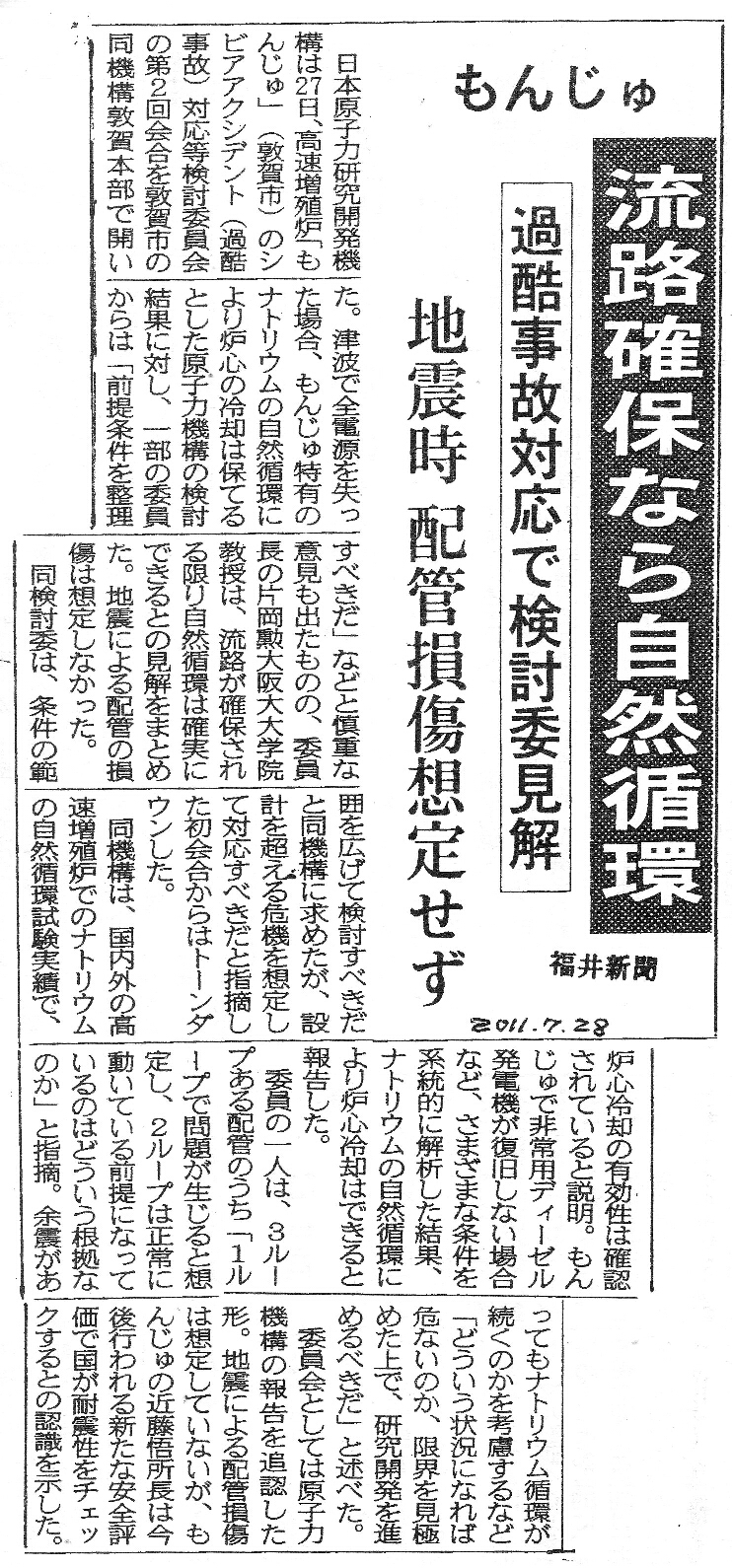 [2011_07_28_02]もんじゅ 流路確保なら自然循環 過酷事故対応で検討委見解 地震時 配管損傷想定せず(福井新聞2011年7月28日)