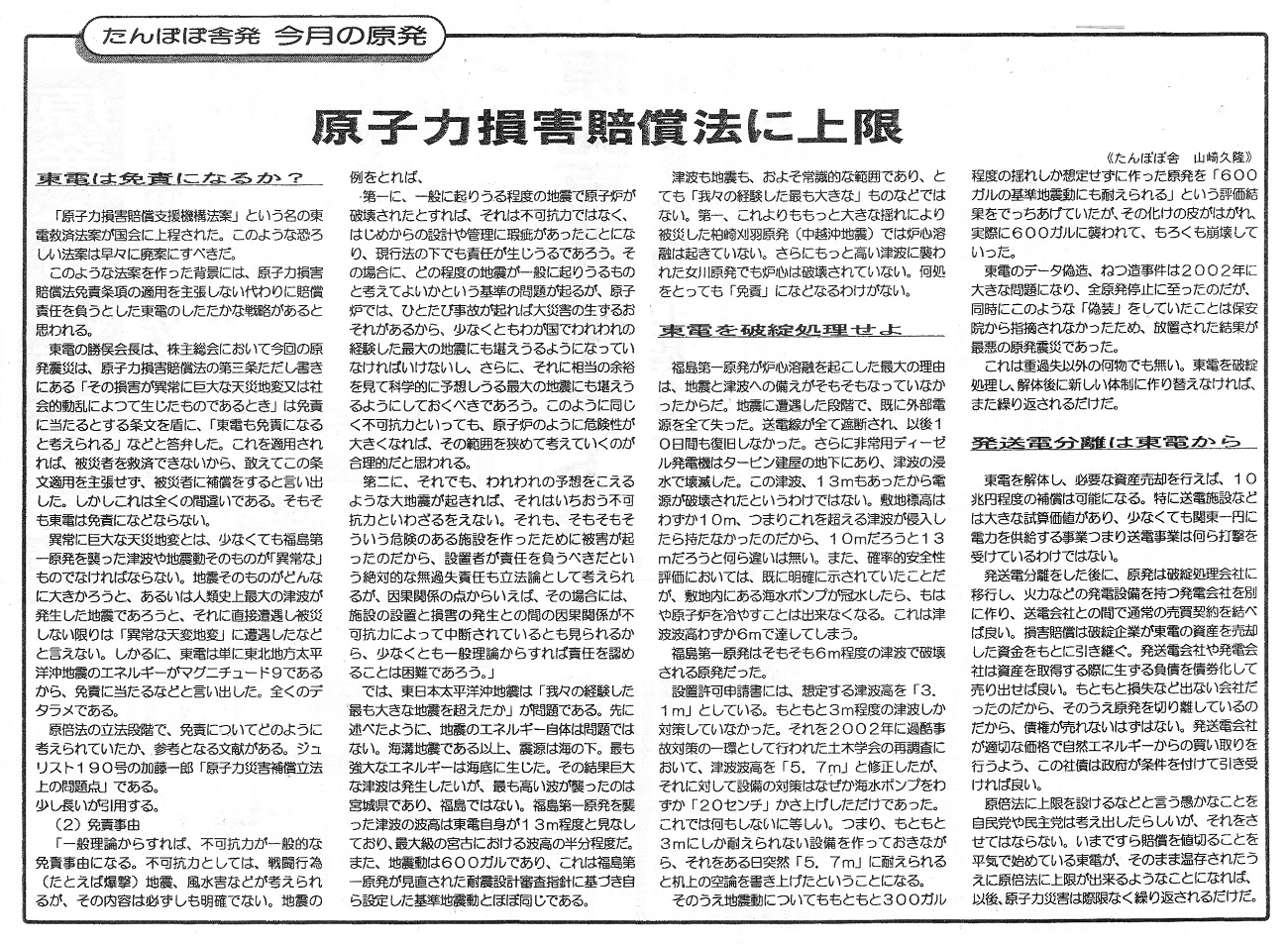 | [2011_07_30_01]たんぽぽ舎 今月の原発 原子力損害賠償法に上限 東電は免責になるのか 東電を破綻処理せよ 発送電分離は東電から(たんぽぽ舎2011年7月30日) |