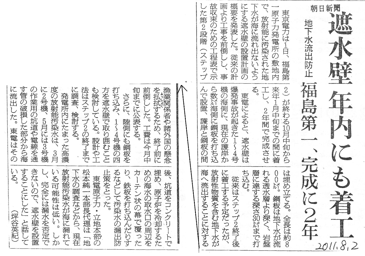 [2011_08_02_01]遮水壁 年内にも着工 地下水流出防止 福島第1、完成に2年(朝日新聞2011年8月2日)