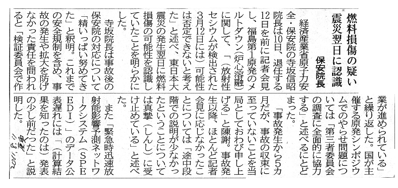 [2011_08_11_01]燃料損傷の疑い 震災翌日に認識 保安院長(東奥日報2011年8月11日)