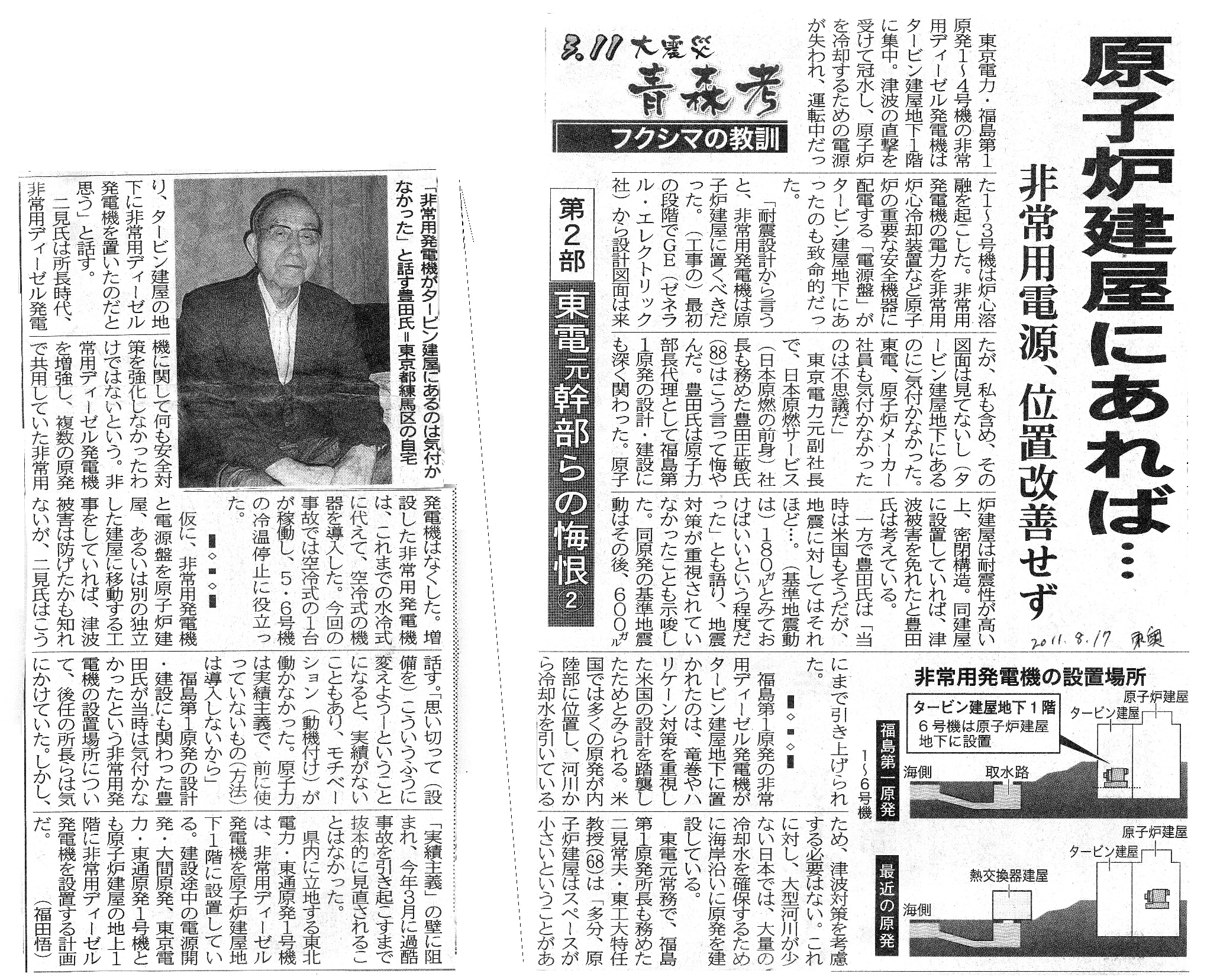 [2011_08_17_01]3.11大震災 青森考 フクシマの教訓 第2部 東電元幹部らの悔恨2 原子炉建屋にあれば・・・ 非常用電源、位置改善せず(東奥日報2011年8月17日)