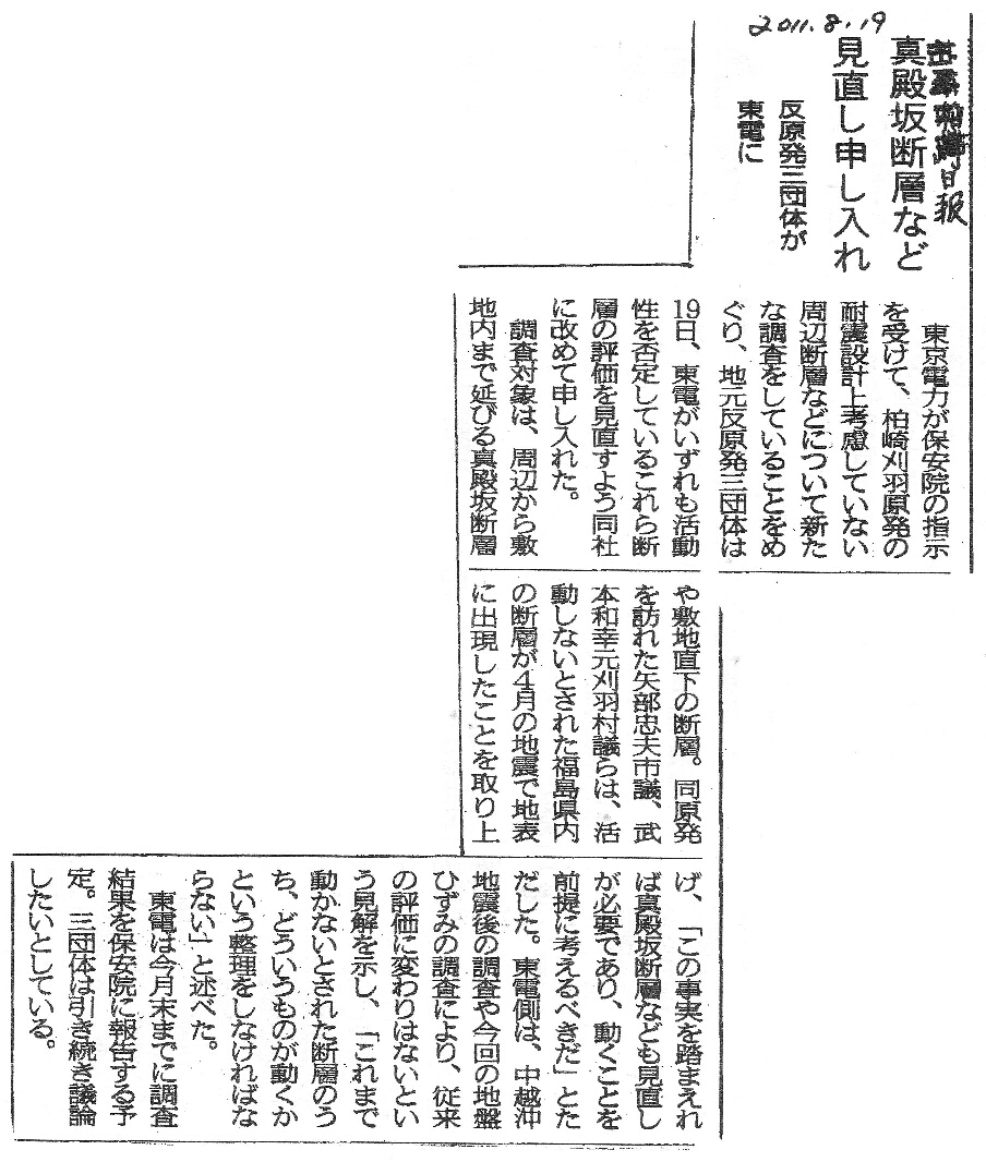 | [2011_08_19_03]真殿坂断層など見直し申し入れ 反原発三団体が東電に(柏崎日報2011年8月19日) |
