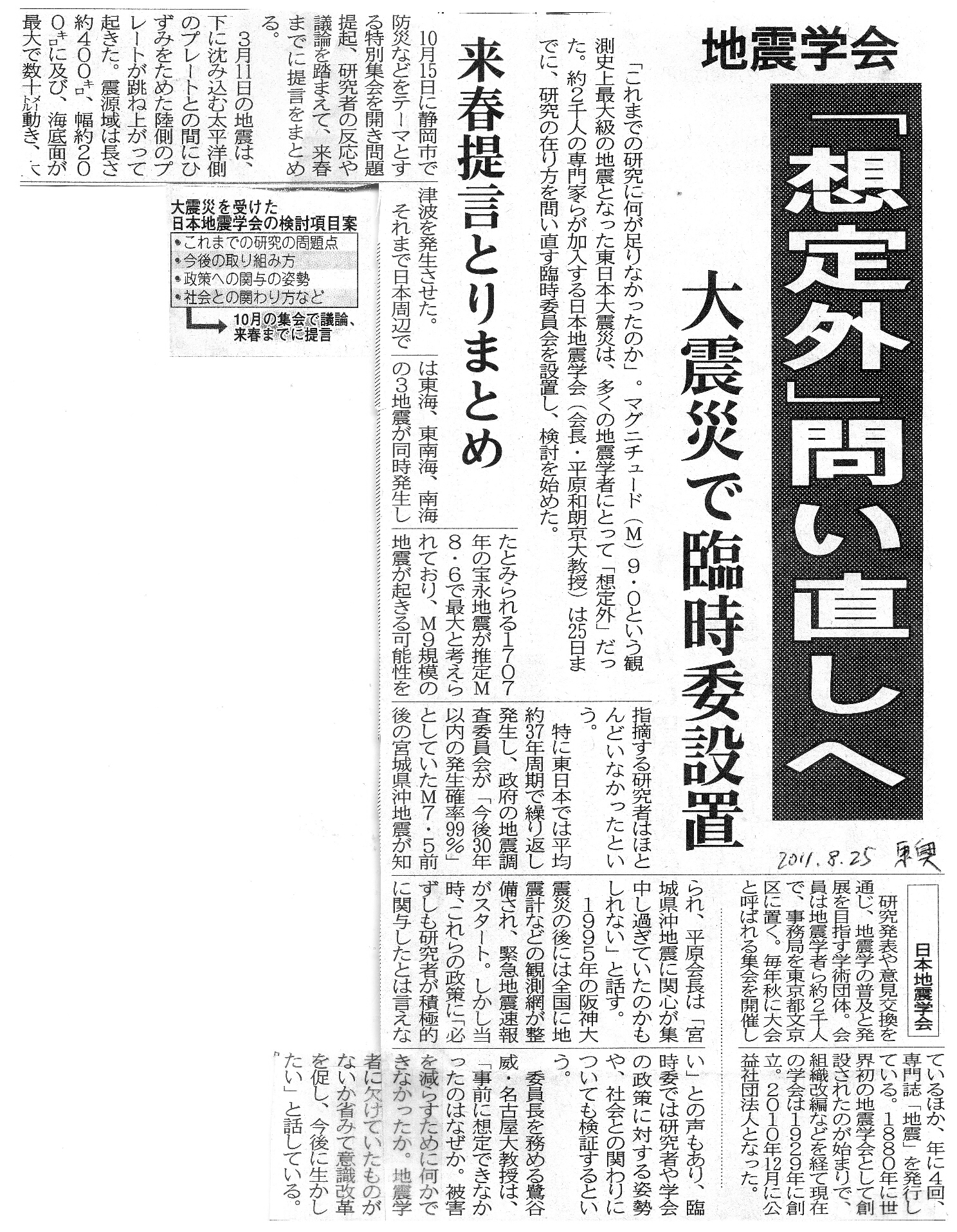 | [2011_08_25_01]地震学会 「想定外」問い直しへ 大震災で臨時委設置 来春提言とりまとめ 日本地震学会(東奥日報2011年8月25日) |