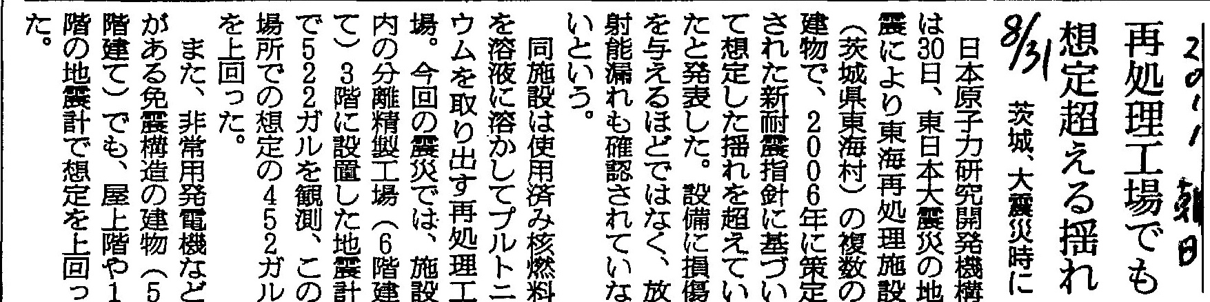 [2011_08_31_03]再処理工場でも想定超える揺れ 茨城、大震災時に(朝日新聞2011年8月31日)