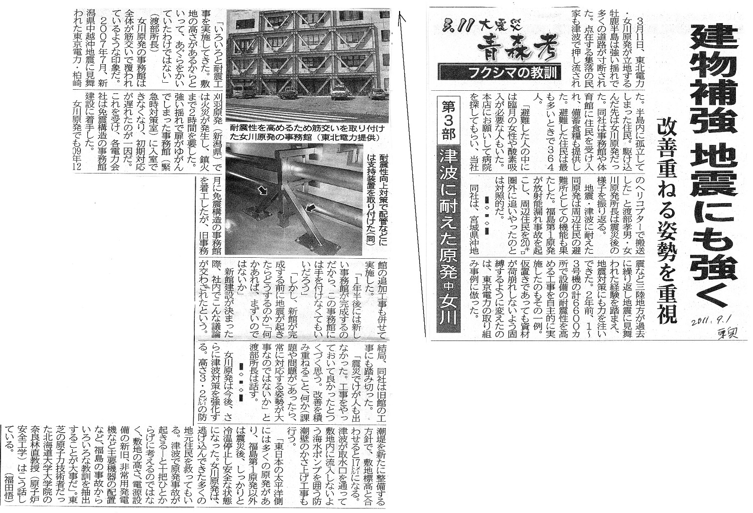| [2011_09_01_01]3.11大震災 フクシマの教訓 第3部 津波に耐えた原発中女川 建物補強 地震にも強く 改善重ねる姿勢を重視(東奥日報2011年9月1日) |