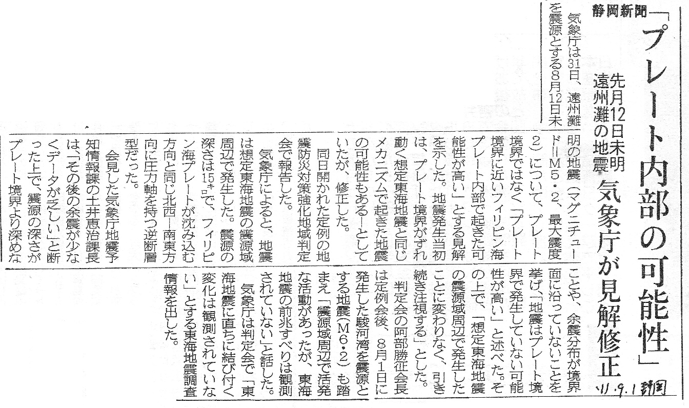 [2011_09_01_02]「プレート内部の可能性」 先月12日未明 遠州灘の地震 気象庁が見解修正(静岡新聞2011年9月1日)