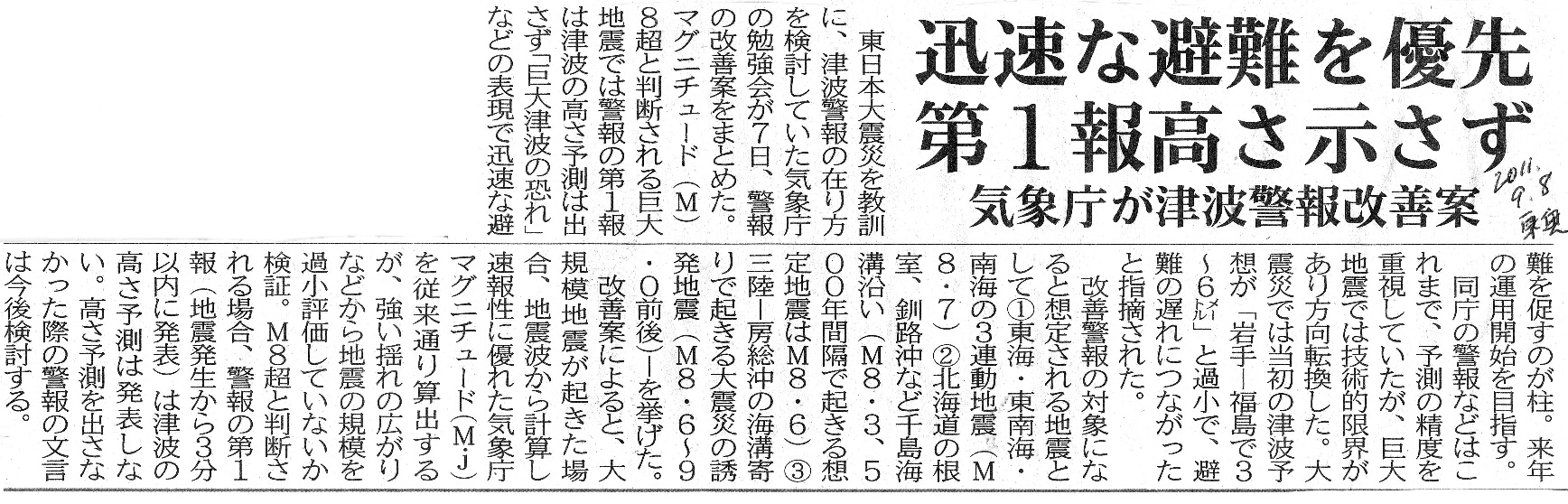 | [2011_09_08_01]迅速な避難を優先 第一報高さ示さず 気象庁が津波警報改善案(東奥日報2011年9月8日) |
