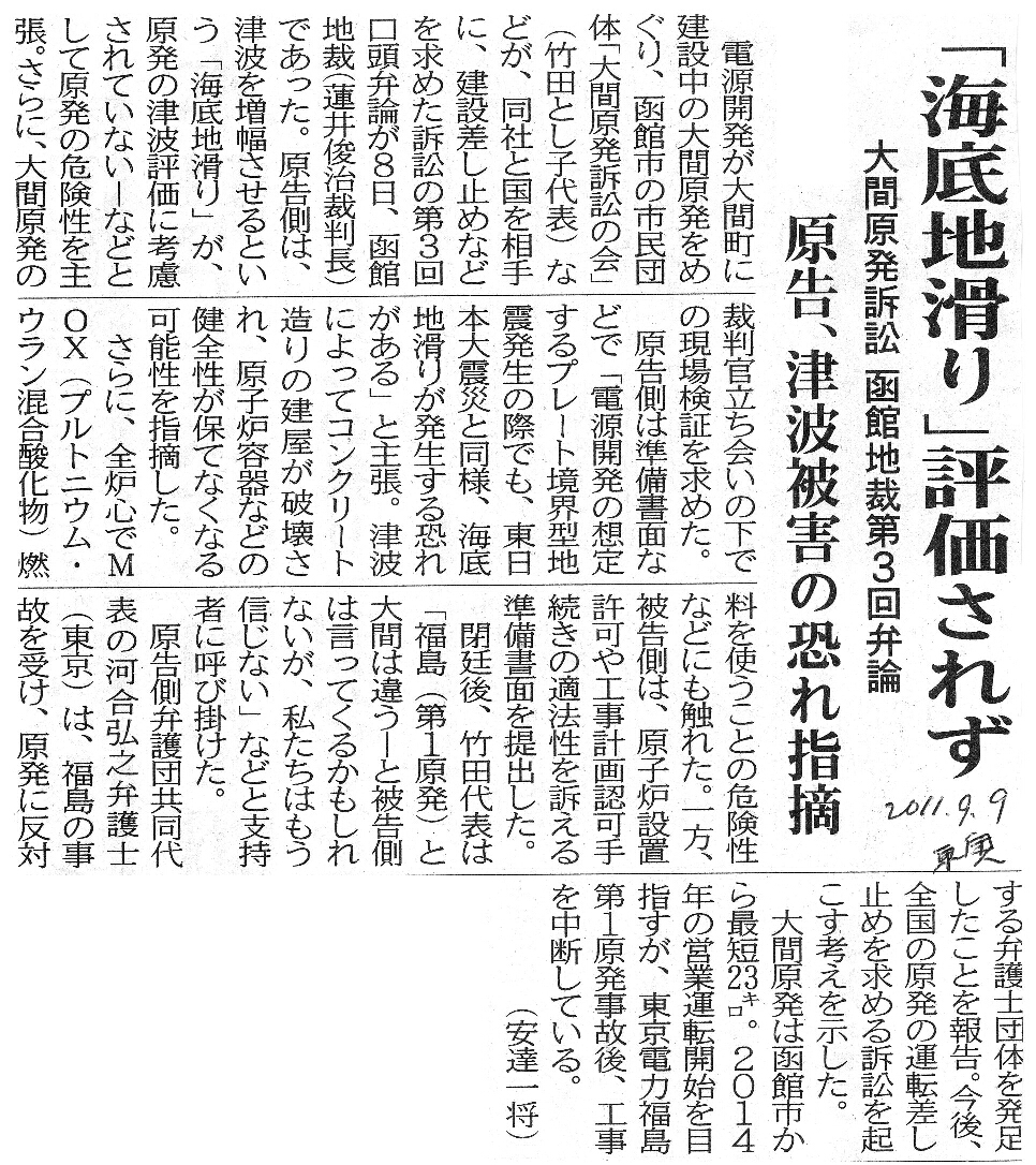 | [2011_09_09_01]「海底地滑り」評価されず 大間原発訴訟 函館地裁第3回弁論 原告、津波被害の恐れ指摘(東奥日報2011年9月9日) |