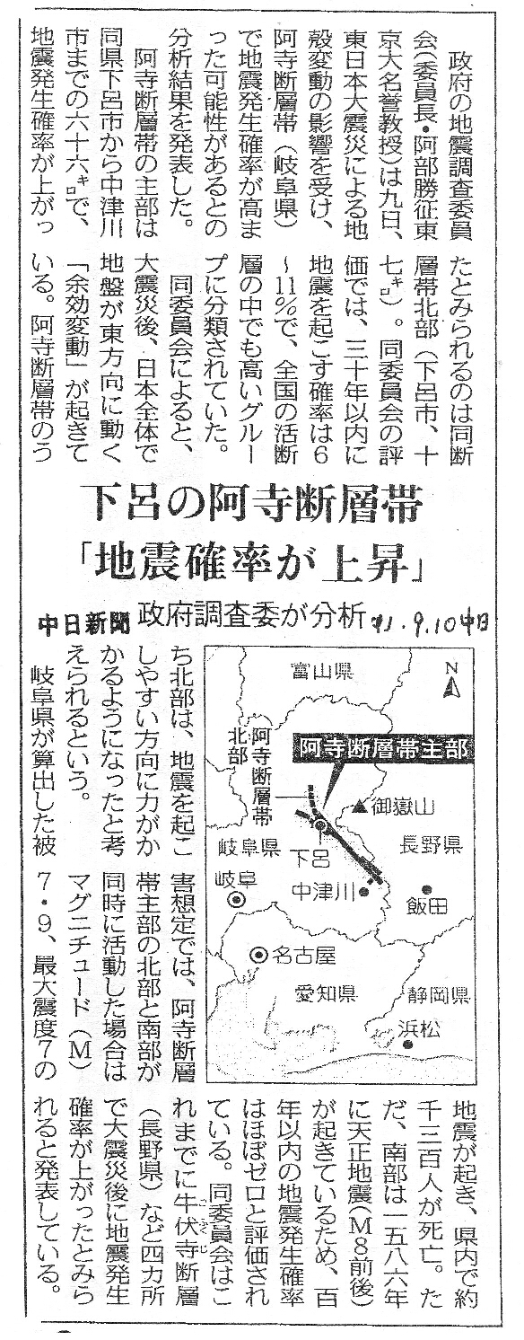 | [2011_09_10_03]下呂の阿寺断層帯 「地震確率が上昇」 政府調査委が分析(中日新聞2011年9月10日) |