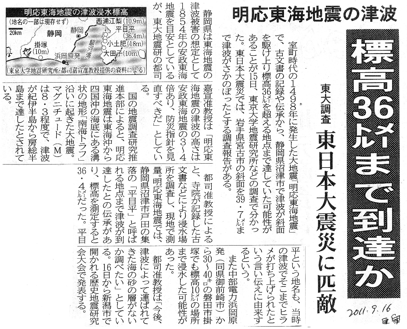 | [2011_09_16_02]明応東海地震の津波 標高36メートルまで到達か 東大調査 東日本大震災に匹敵(東奥日報2011年9月16日) |