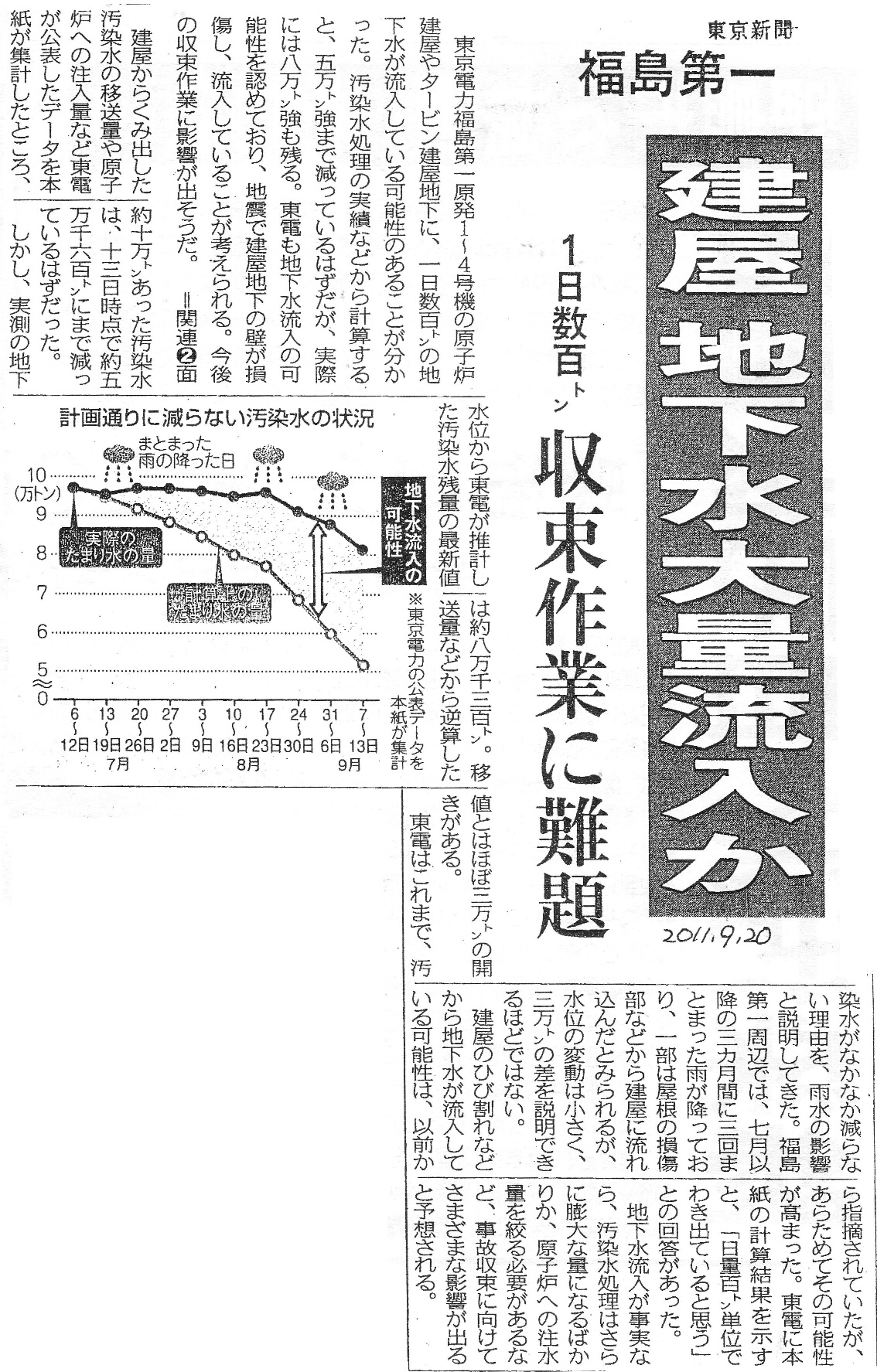 [2011_09_20_01]福島第1 建屋 地下水大量流入か 1日数百トン 収束作業に難題(東京新聞2011年9月20日)