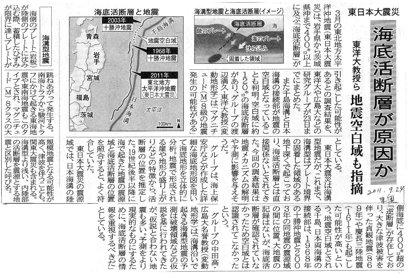 | [2011_09_24_01]東日本大震災 海底活断層が原因か 東洋大教授ら 地震空白域も指摘(東奥日報2011年9月24日) |
