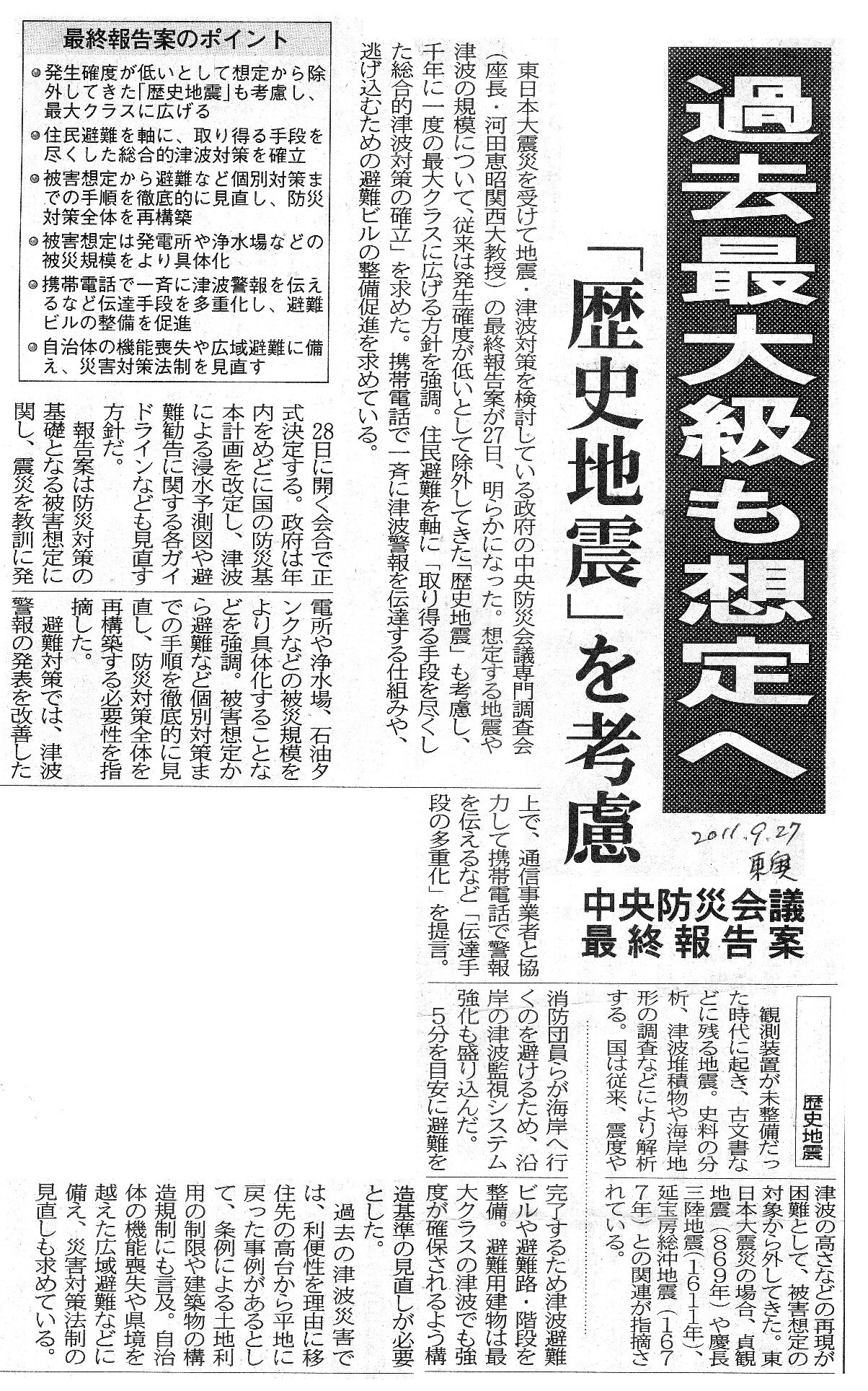 | [2011_09_27_02]過去最大級も想定へ 「歴史地震」を考慮 中央防災会議最終報告案(東奥日報2011年9月27日) |