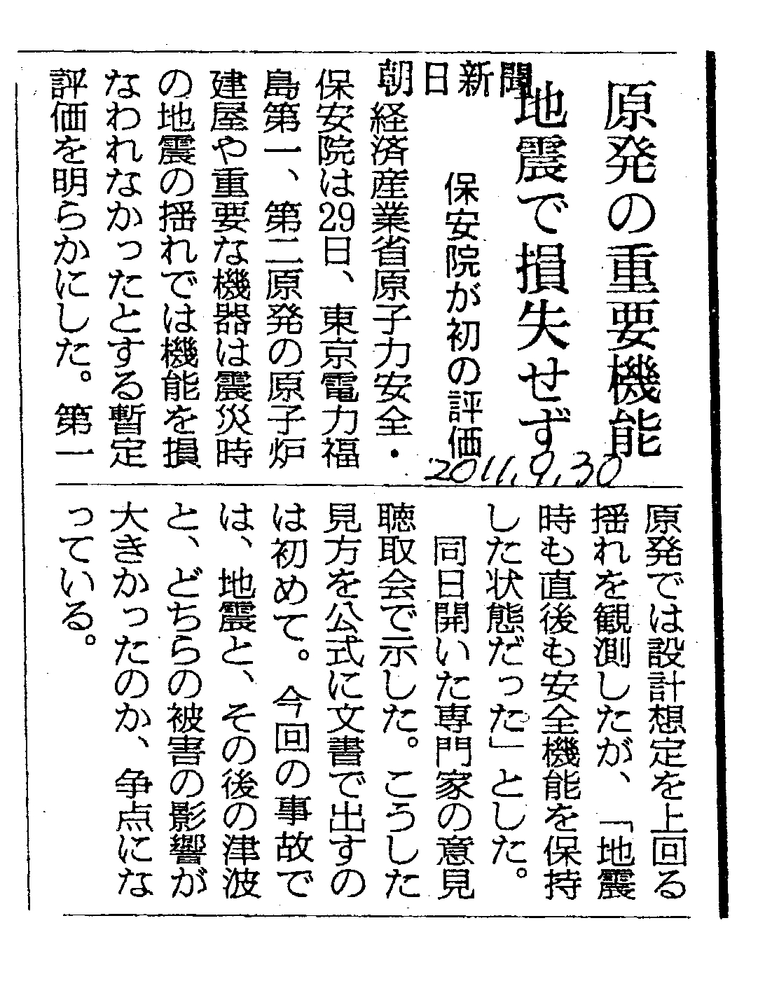 [2011_09_30_01]保安院が初の評価 原発の重要機能 地震で損失せず(朝日新聞2011年9月30日)
