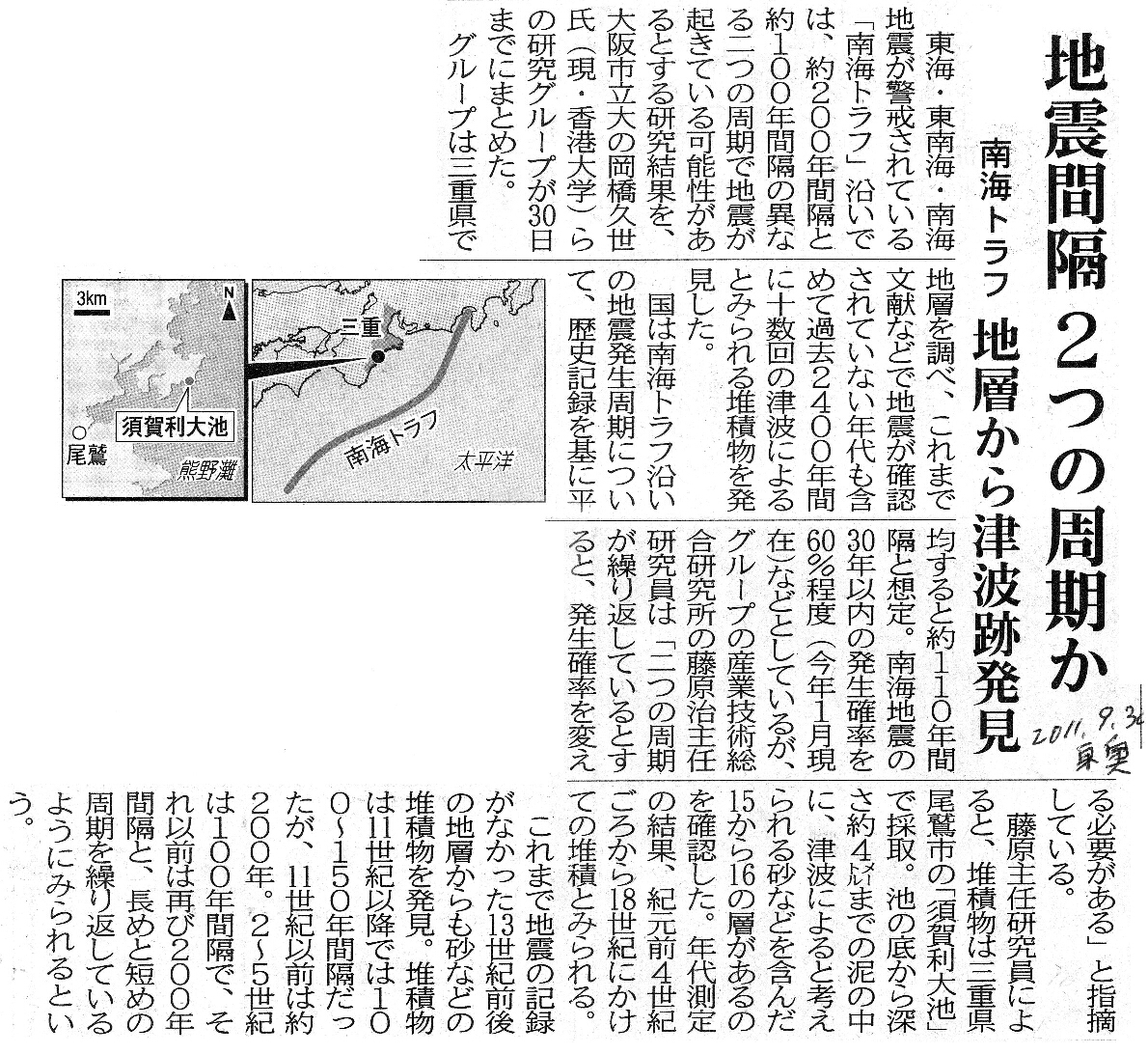 | [2011_09_30_03]地震間隔 2つの周期か 南海トラフ 地層から津波跡発見(東奥日報2011年9月30日) |