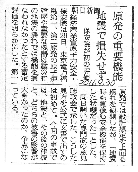 [2011_09_30_04]原発の重要機能 地震で損失せず 保安院が初の評価(朝日新聞2011年9月30日)