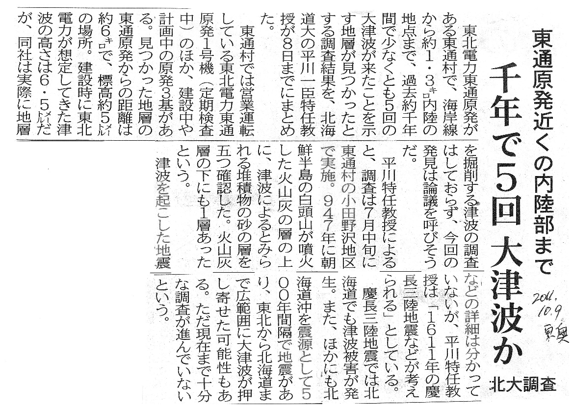 | [2011_10_09_01]東通原発近くの内陸部まで 千年で5回大津波か 北大調査(東奥日報2011年10月9日) |