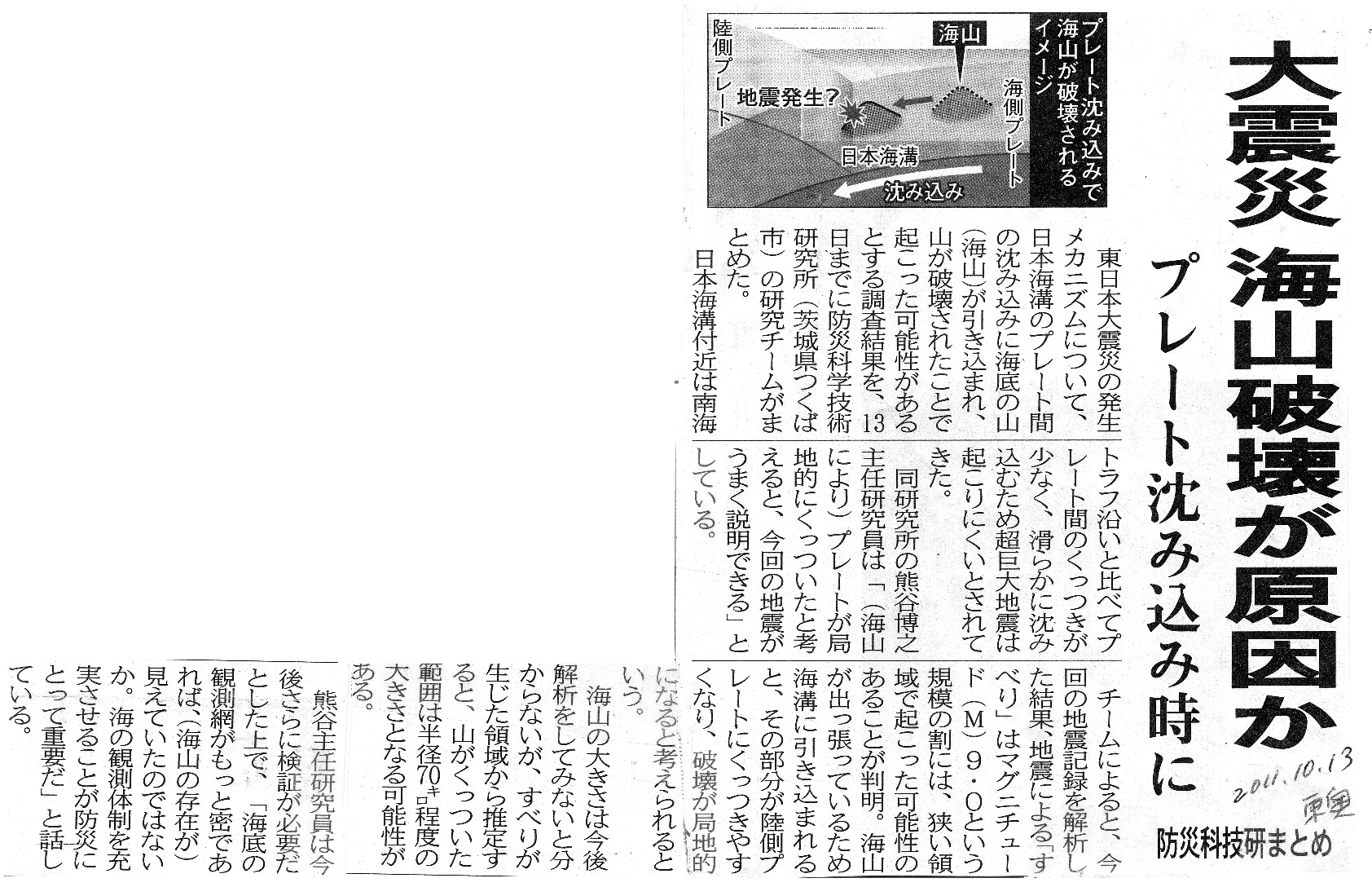[2011_10_13_01]大震災 海山破壊が原因か プレート沈み込み時に 防災科技研まとめ(東奥日報2011年10月13日)