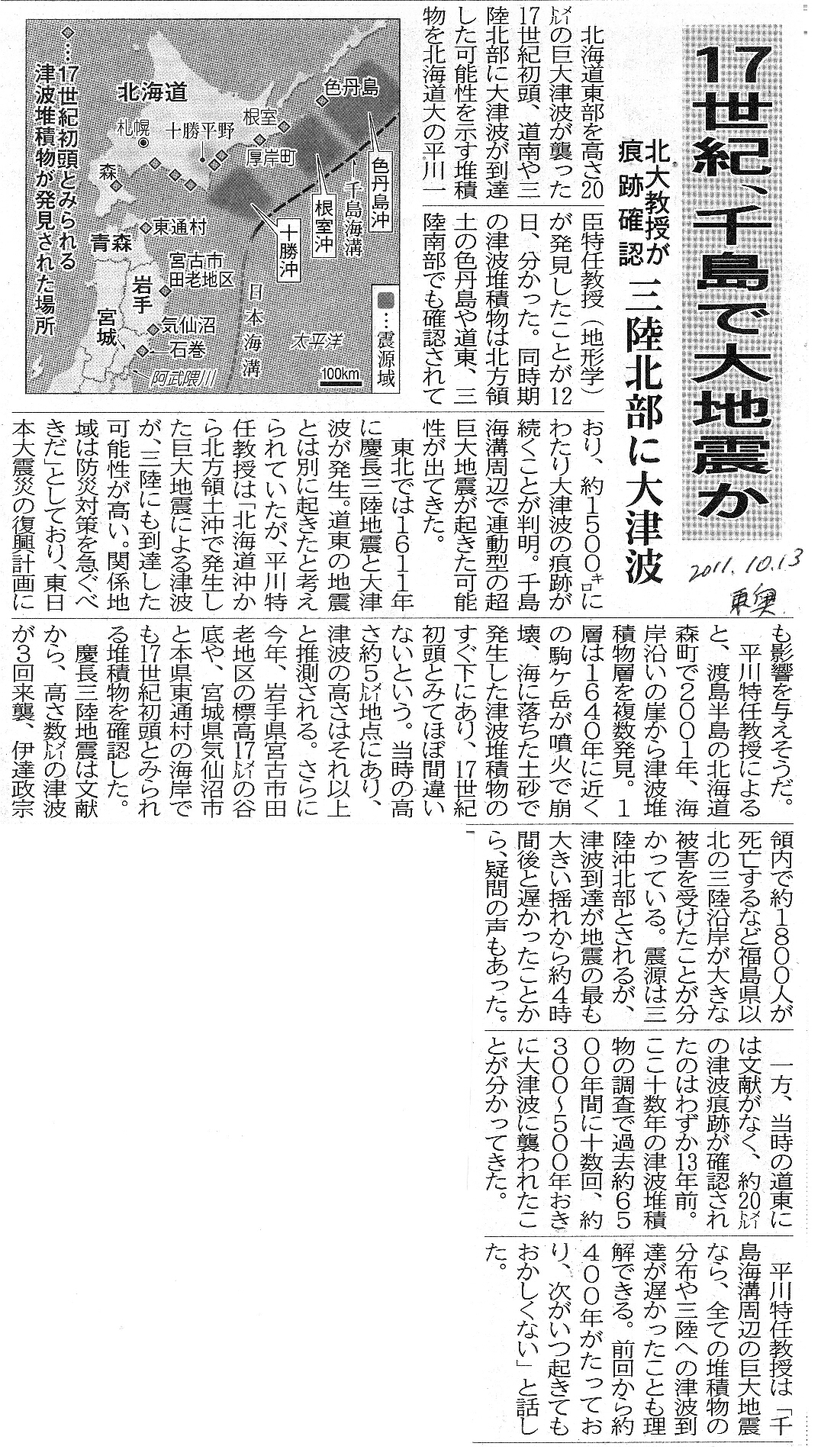 | [2011_10_13_02]17世紀、千島で大地震か 北大教授が痕跡確認 三陸北部に大津波(東奥日報2011年10月13日) |