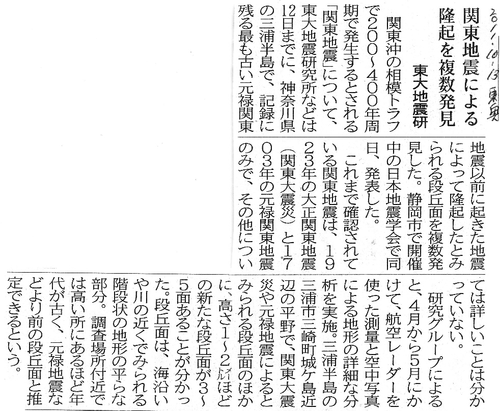 ※以下は上記本文中から重要と思われるヶ所を抜粋し、テキスト化したものである 関東沖の相模トラフで200〜400年周期で発生するとされる「関東地震」について、東大地震研究所などは12日までに、神奈川県の三浦半島で、記録に残る最も古い元禄関東地震以前に起きた地震によって隆起したとみられる段丘面を複数発見した。 |