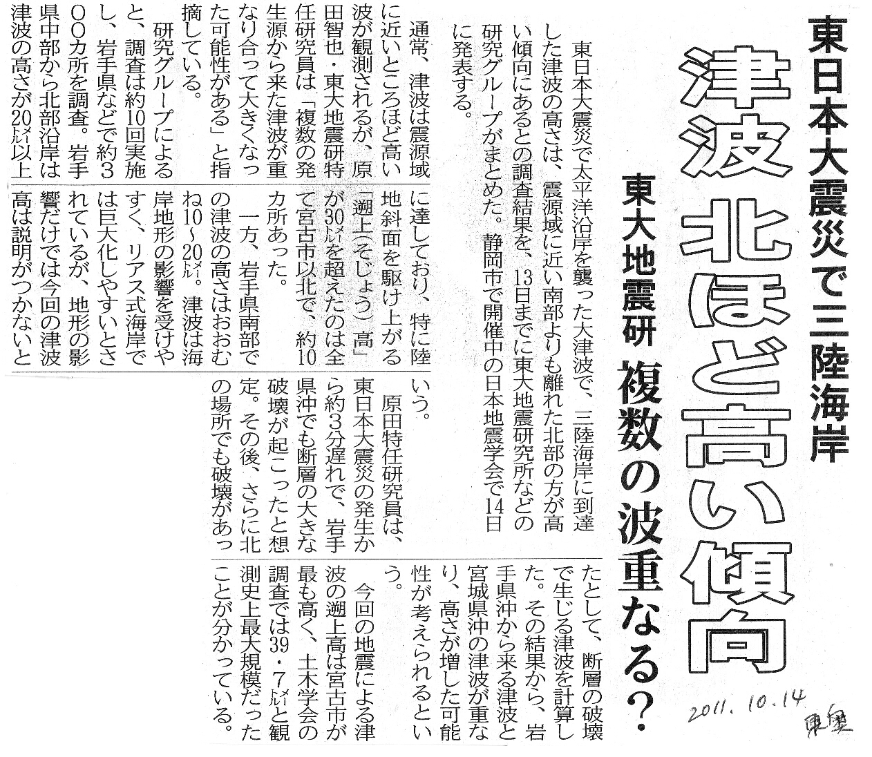 | [2011_10_14_01]東日本大震災で三陸海岸 津波 北ほど高い傾向 東大地震研 複数の波重なる?(東奥日報2011年10月14日) |