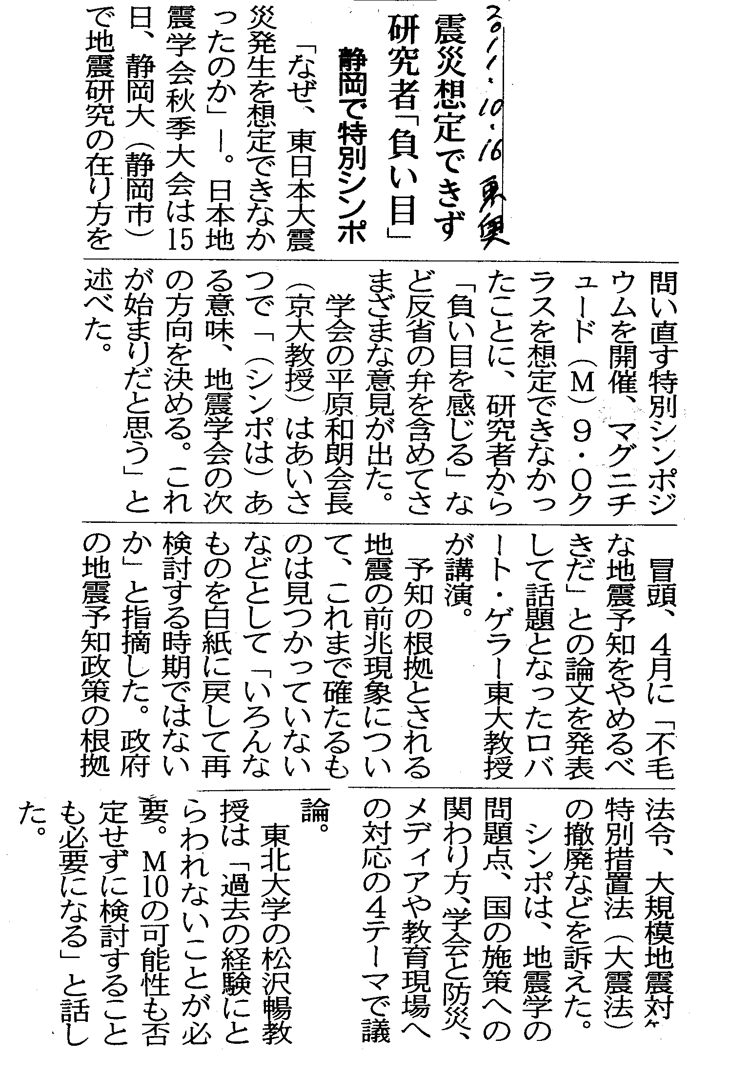[2011_10_16_02]震災想定できず研究者「負い目」 静岡で特別シンポ(東奥日報2011年10月16日)