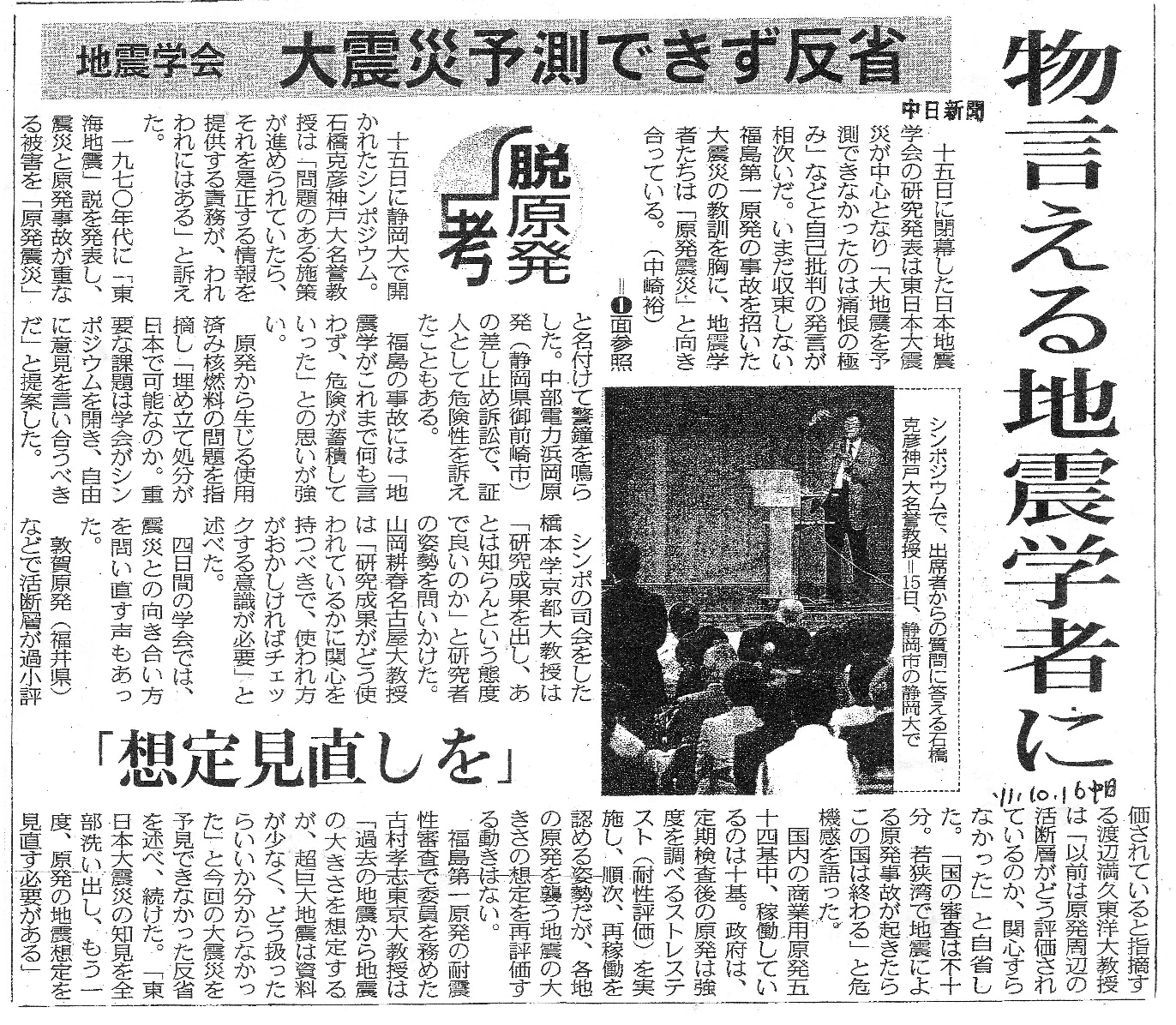 | [2011_10_16_04]脱原発考 地震学会 大震災よそくできず反省 物言える地震学者に 「想定見直しを」(中日新聞2011年10月16日) |