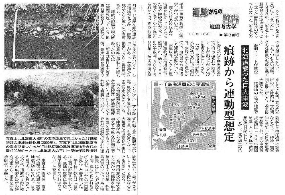 「とんでもないものを見つけてしまった」−。1998年、北海道・十勝平野の太平洋岸で、切り立った海岸段丘のてっぺんに立った北海道大の平川一臣特任教授(地形学)がつぶやいた。 高さ15メートルの段丘上に、海底を転がって丸くなった石や海砂が広がる。この高さをやすやすと越えられたのは、高さ20メートル級の巨大津波しかない。 「とてつもない規模。どんな地震か想像を絶する」 海側プレートが陸の下に潜り込む千島海溝周辺では引き込まれた陸側プレートが跳ね上がるたびに地震を起こしてきた。 だが、北海道で詳細な文献が残るのは19世紀以降。記録の空白を埋めたのは、研究者が地道に探した津波の痕跡だった。 98年以降、こうした津波堆積物は北海道各地で確認され、過去6500年に十数回、300〜500年ごとに大津波が襲来したと判明。高さ約20メートルの巨大津波は17世紀初頭と最も新しく、過去最大級だった。 堆積物の分布や地震で隆起した海岸段丘の調査などから、十勝沖、根室沖で発生した連動型地震が想定され、国の中央防災会議は「500年間隔地震」という名称で被害想定の対象とした。 しかし、北方領土の色丹島で17世紀初頭の津波堆積物が見つかり、震源域はさらに東へ広がる可能性も。 「津波の規模や浸水域は毎回異なっている。地震も単独発生や連動型などさまざまなバリエーションがあり、十勝沖から根室沖、さらに色丹島沖、択捉島沖と連動した時もあったのでは」 北海道は東日本大震災後、想定地震を見直すワーキンググループを設置。津波による浸水予測図の改定を始めている。 東大地震研究所の古村孝志教授は「連動型地震が怖いのばプレートがずれ動く範囲だけでなく、ずれ動く量(断層が食い違う量)も大きくなり、大規模な海底変動が生じて津波が高くなること。加えて十数分の時間差で地震が連動すると、それぞれの地震で生まれた津波が重なり、高さがさらに1・5〜2倍になることもある」と言う。 老中田沼意次の命で北方へ向かった探検家最上徳内は1786年、択捉島東方のウルップ島(得撫島)に日本人で初めて上陸。津波で丘に打ちあげられたロシアの大型船を見た、と書き残した。 平川特任教授は「自然は正直に記録を残している。地球の歴史に学び、将来を考えなければならない」と警告した。 ◇ 東日本大震災後、震源域の周辺では余震や誘発地震が続いている。日本列島で今、何が起きているのか。遺跡や文献に残る災害の痕跡と最新の研究成果から、未来を守る手掛かりを探った。 |