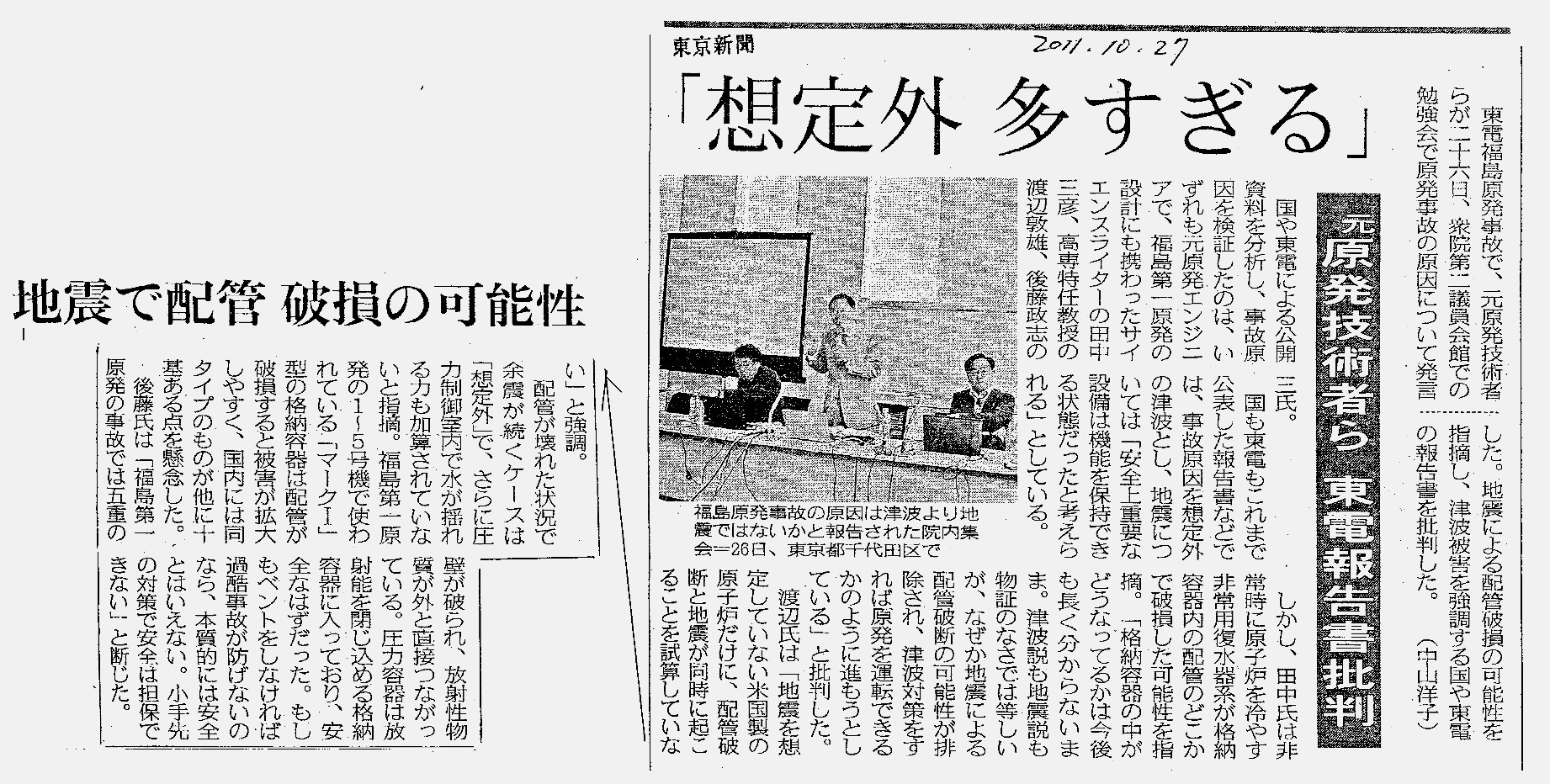 [2011_10_27_01]元技術者ら東電報告書批判 地震で配管破損の可能性(東京新聞2011年10月27日)