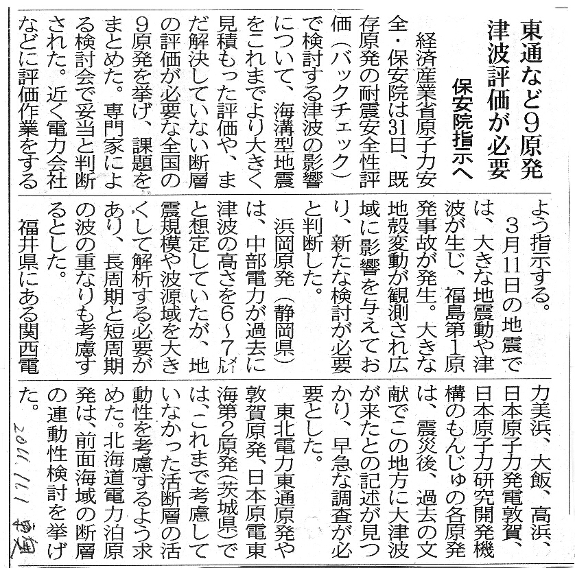 | [2011_11_01_01]東通など9原発津波評価が必要 保安院指示へ(東奥日報2011年11月1日) |