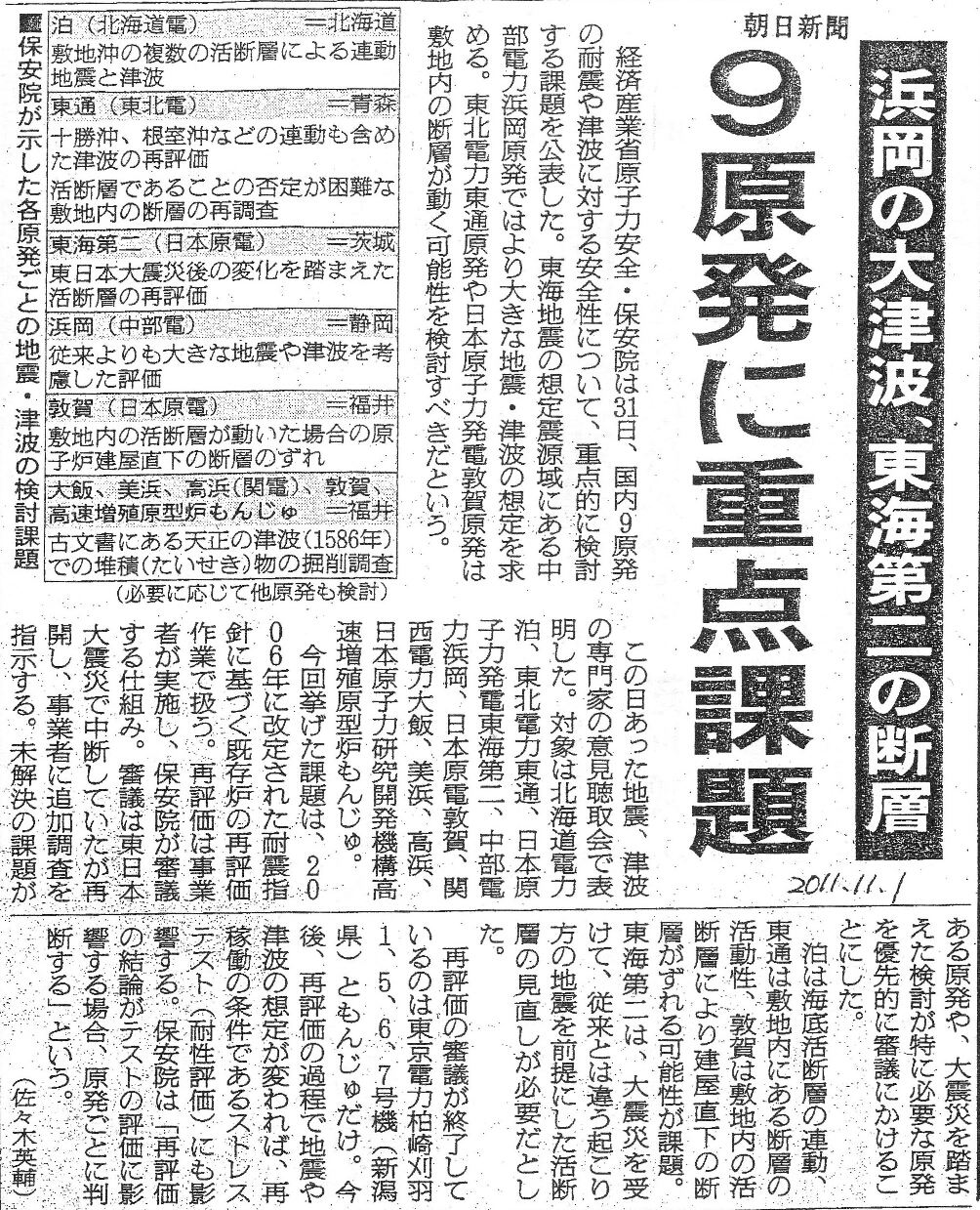 | [2011_11_01_03]浜岡の大津波、東海第2の断層 9原発に重点課題(朝日新聞2011年11月1日) |