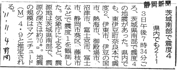 [2011_11_04_01]茨城南部で震度4 県内でも2〜1(静岡新聞2011年11月4日)