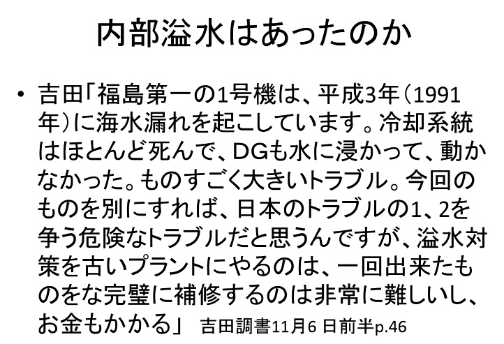・吉田「福島第−の1号機は、平成3年(1991年)に海水漏れを起こしています。冷却系統はほとんど死んで、DGも水に浸かって、動かなかった。ものすごく大きいトラブル。今回のものを別にすれば、日本のトラブルの1、2を争う危険なトラブルだと思うんですが、溢水対策を古いプラントにやるのは、一回出来たものをな完聖に補修するのは非常に難しいし、お金もかかる」