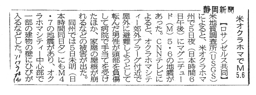 [2011_11_07_01]米オクラホマでM5.6(静岡新聞2011年11月7日)