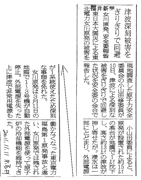 | [2011_11_11_01]津波深刻被害をぎりぎりで回避 女川原発、安全委報告(福井新聞2011年11月11日) |