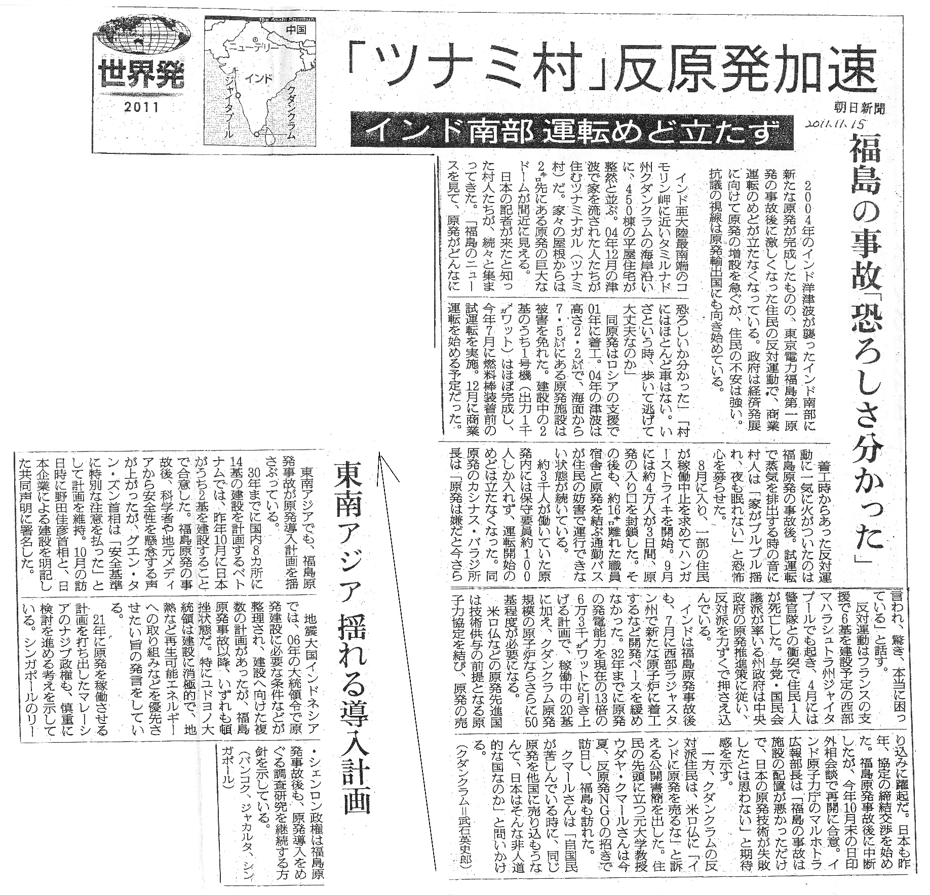 | [2011_11_15_03]世界発2011 「ツナミ村」反原発加速 インド南部 運転めど立たず 福島の事故 「恐ろしさ分かった」(朝日新聞2011年11月15日) |