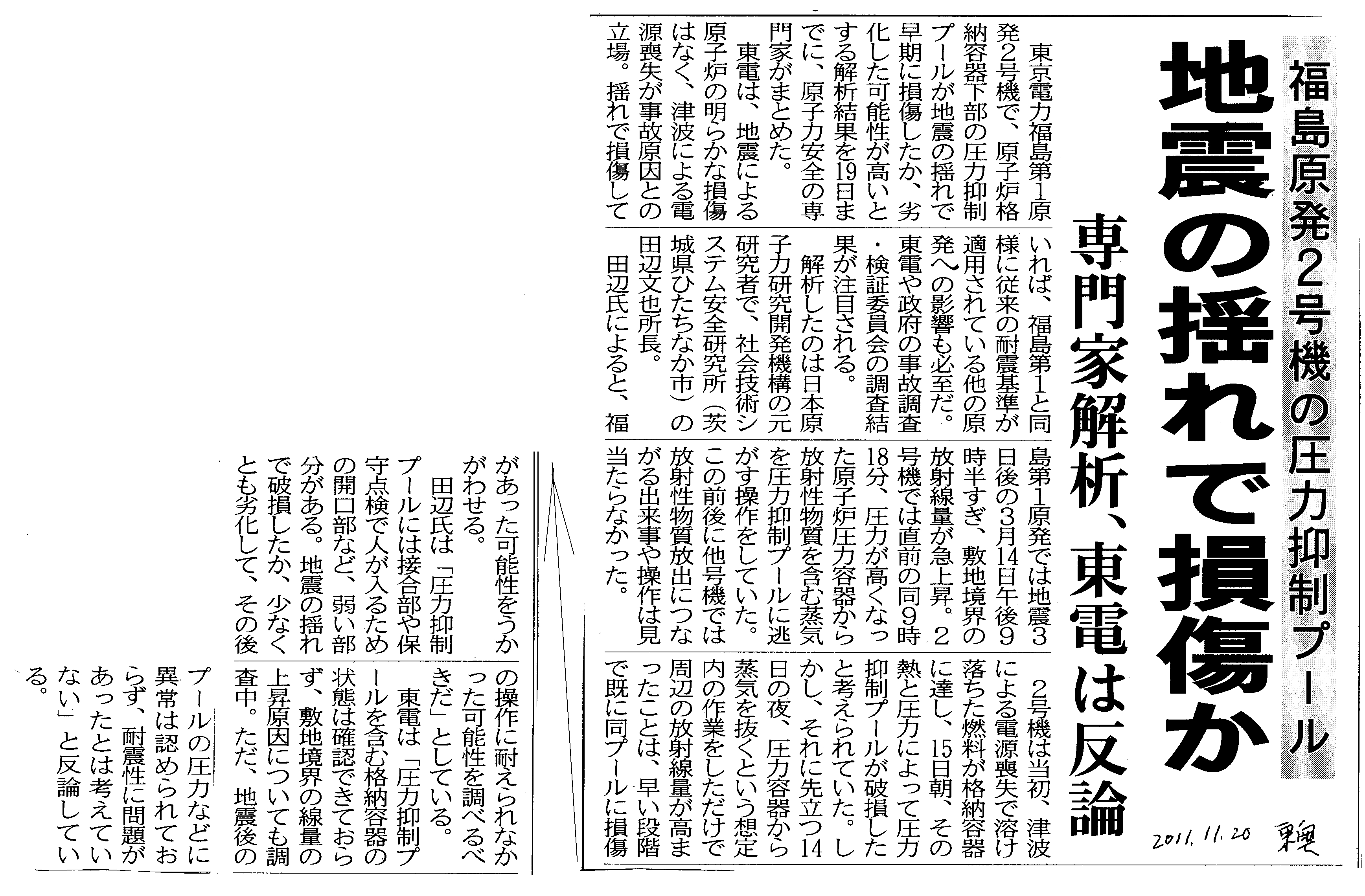[2011_11_20_01]福島原発2号機の圧力抑制プール 地震の揺れで損傷か 専門家解析、東電は反論(東奥日報2011年11月20日)