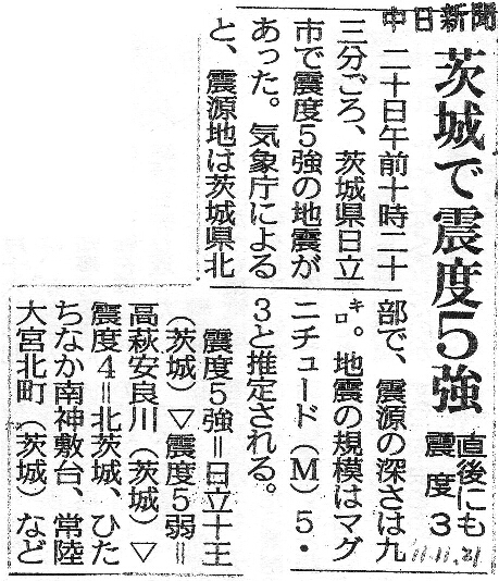 [2011_11_21_01]茨城で震度5強 直後にも震度3(中日新聞2011年11月21日)