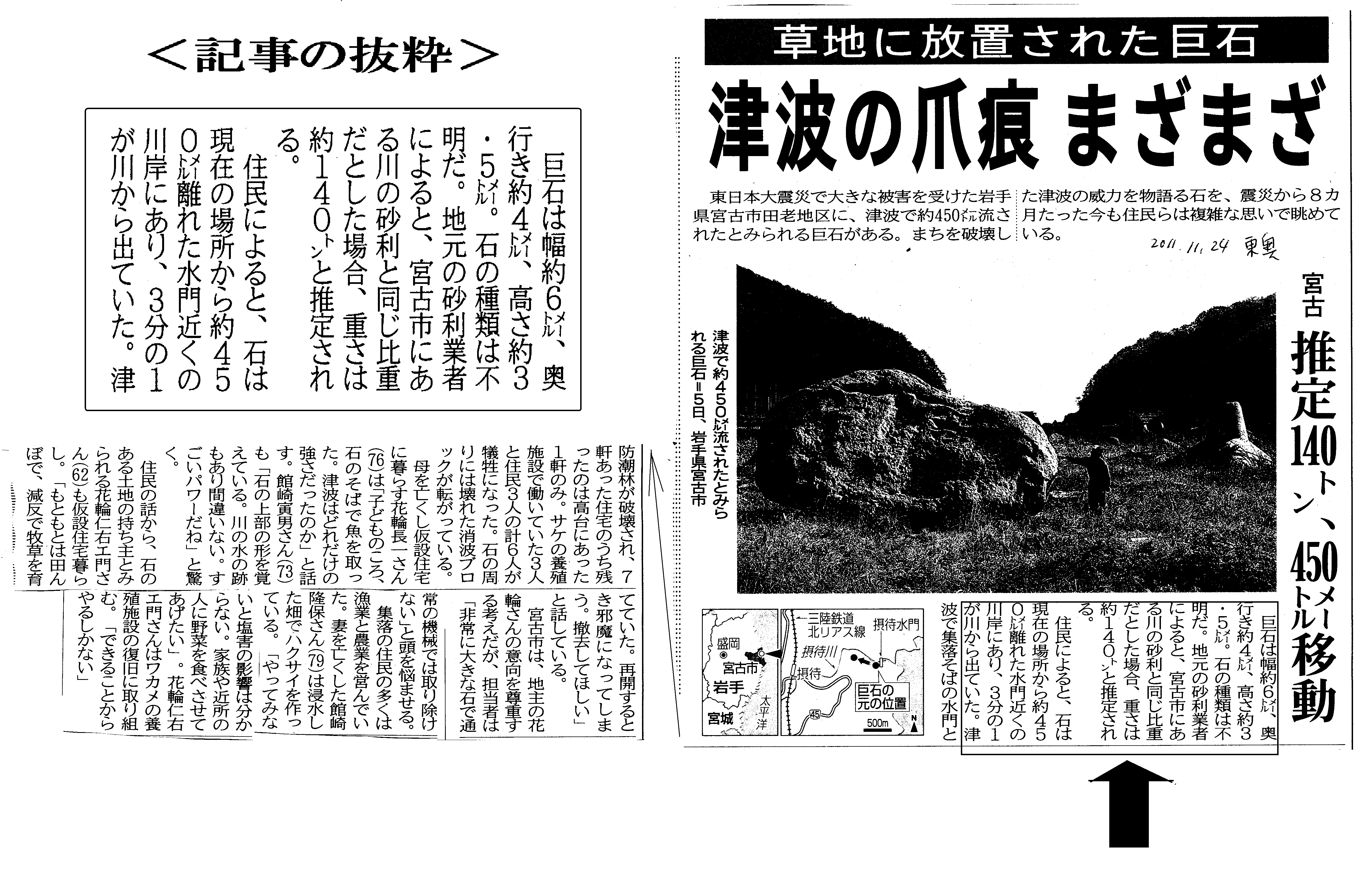 | [2011_11_24_01]津波の爪痕まざまざ 宮古 推定140トン、450m移動(東奥日報2011年11月24日) |