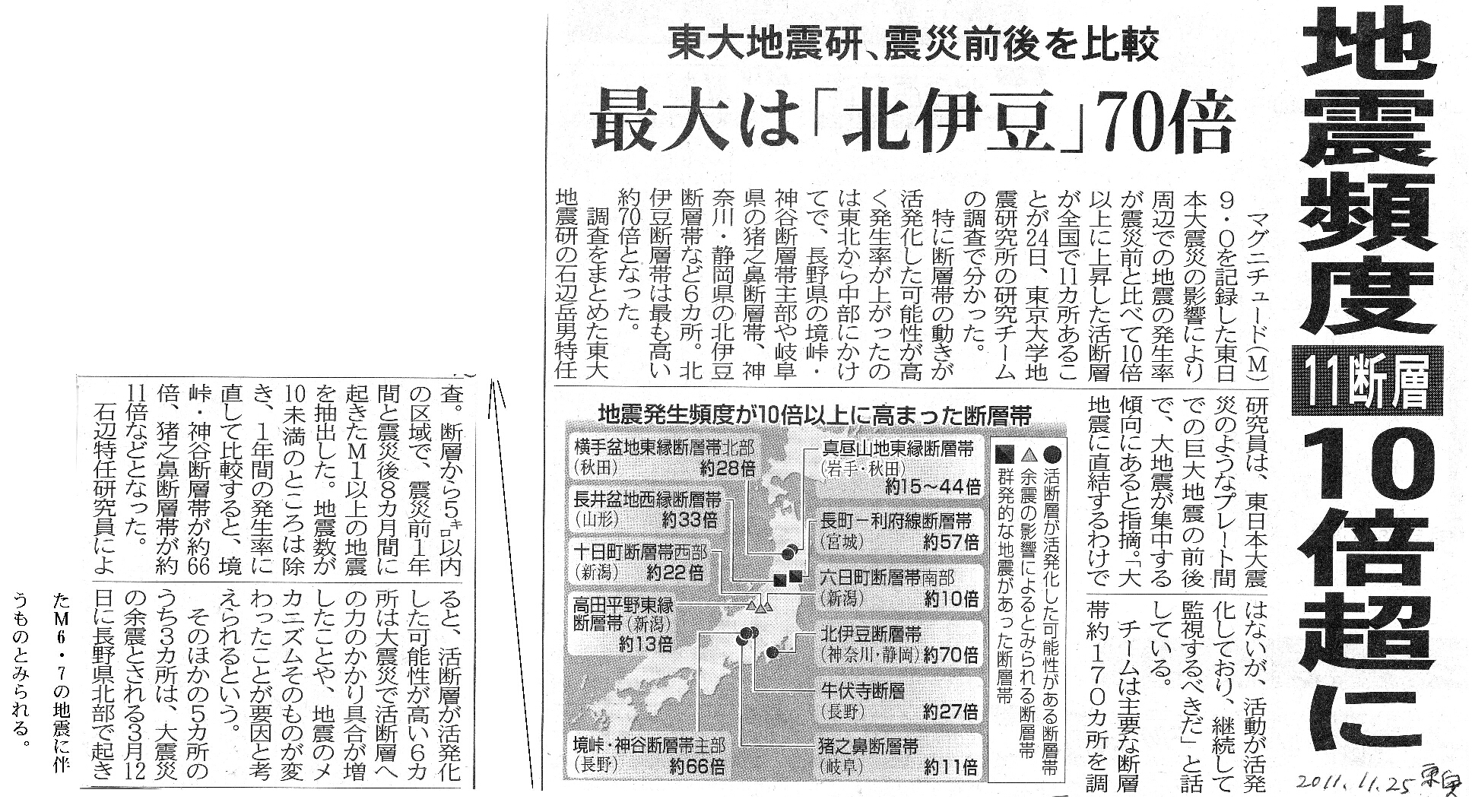 [2011_11_25_01]地震頻度 11断層 10倍超に 東大地震研、震災前後を比較 最大は「北伊豆」70倍(東奥日報2011年11月25日)