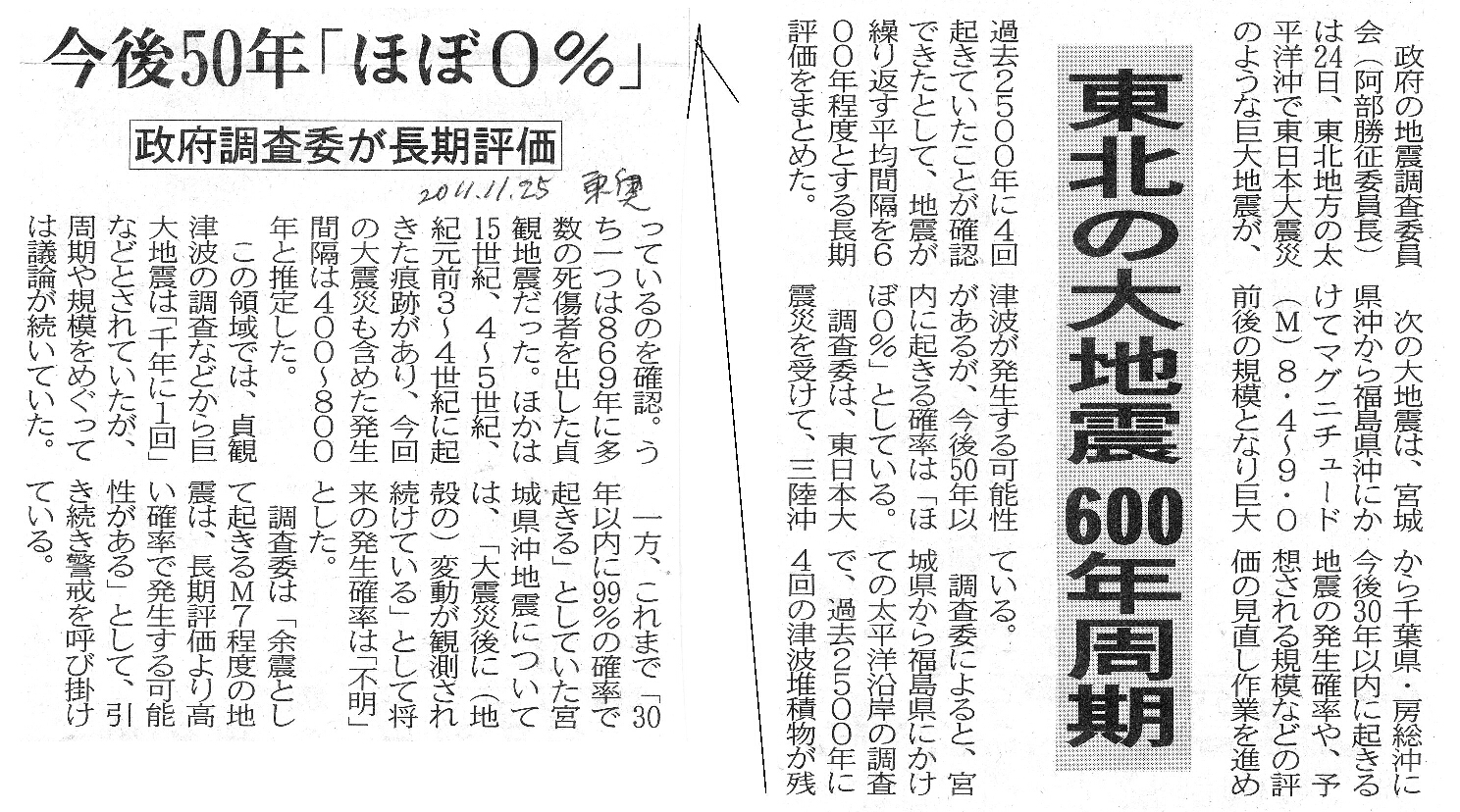 | [2011_11_25_02]東北の大地震 600年周期 今後50年「ほぼ0%」 政府調査委が長期評価(東奥日報2011年11月25日) |
