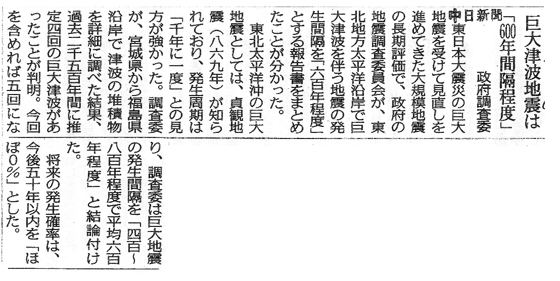 ※以下は上記本文中から重要と思われるヶ所を抜粋し、テキスト化したものである 東日本大震災の巨大地震を受けて見直しを進めてきた大規模地震の長期評価で、政府の地震調査委員会が、東北地方太平洋沿岸で巨大津波を伴う地震の発生間隔を「600年程度」とする報告書をまとめたことが分かった。(後略) |