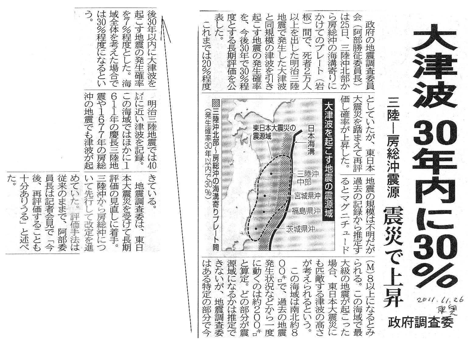 | [2011_11_26_01]大津波 30年内に30% 三陸−房総沖震源 震災で上昇 政府調査委(東奥日報2011年11月26日) |