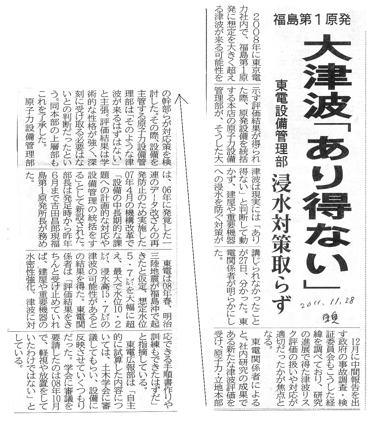 | [2011_11_28_01]福島第一原発 大津波「あり得ない」 東電設備管理部 浸水対策取らず(東奥日報2011年11月28日) |