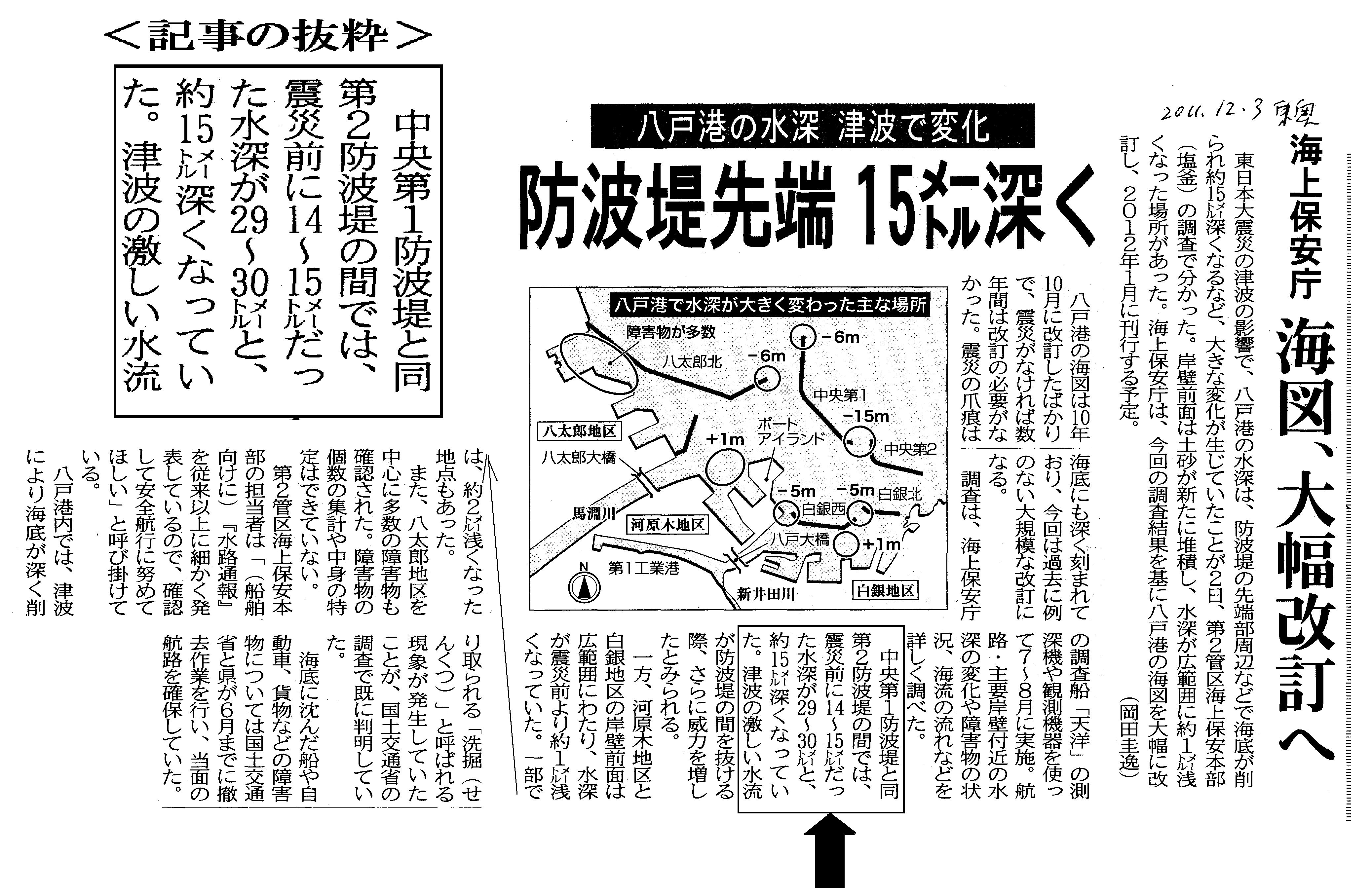 | [2011_12_03_01]八戸港の水深 津波で変化 防波堤先端15メートル深く(東奥日報2011年12月3日) |