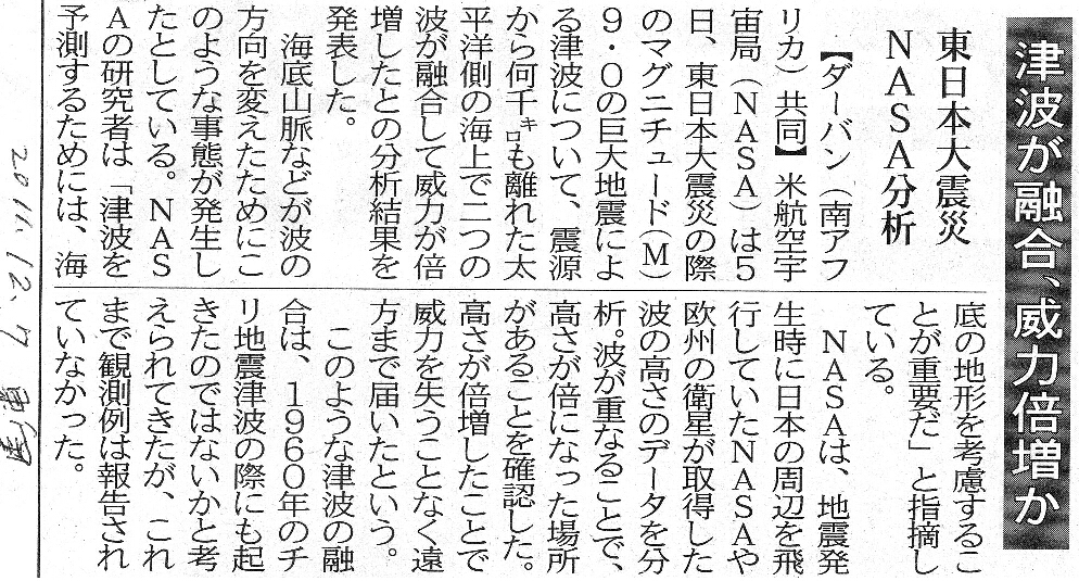 | [2011_12_07_01]津波が融合、威力倍増か 東日本大震災 NASA分析(東奥日報2011年12月7日) |