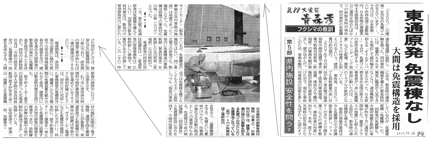 | [2011_12_16_01]3.11大震災 青森考 フクシマの教訓 第5部 県内施設安全性を問う2 東通原発 免震棟なし 大間は免震構造を採用 (東奥日報2011年12月16日) |
